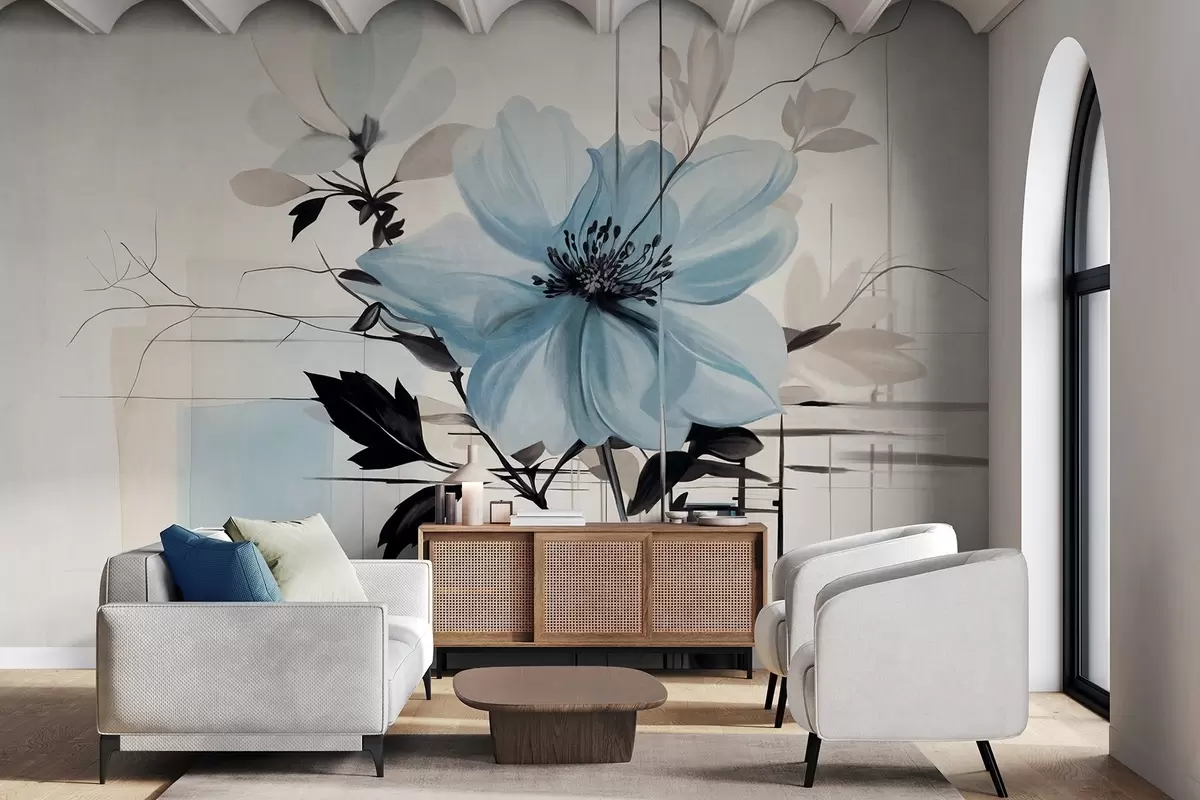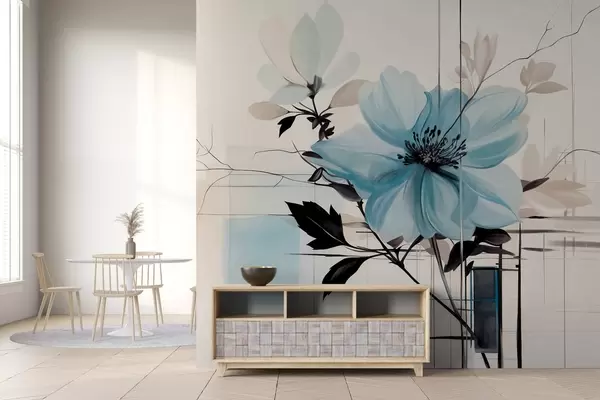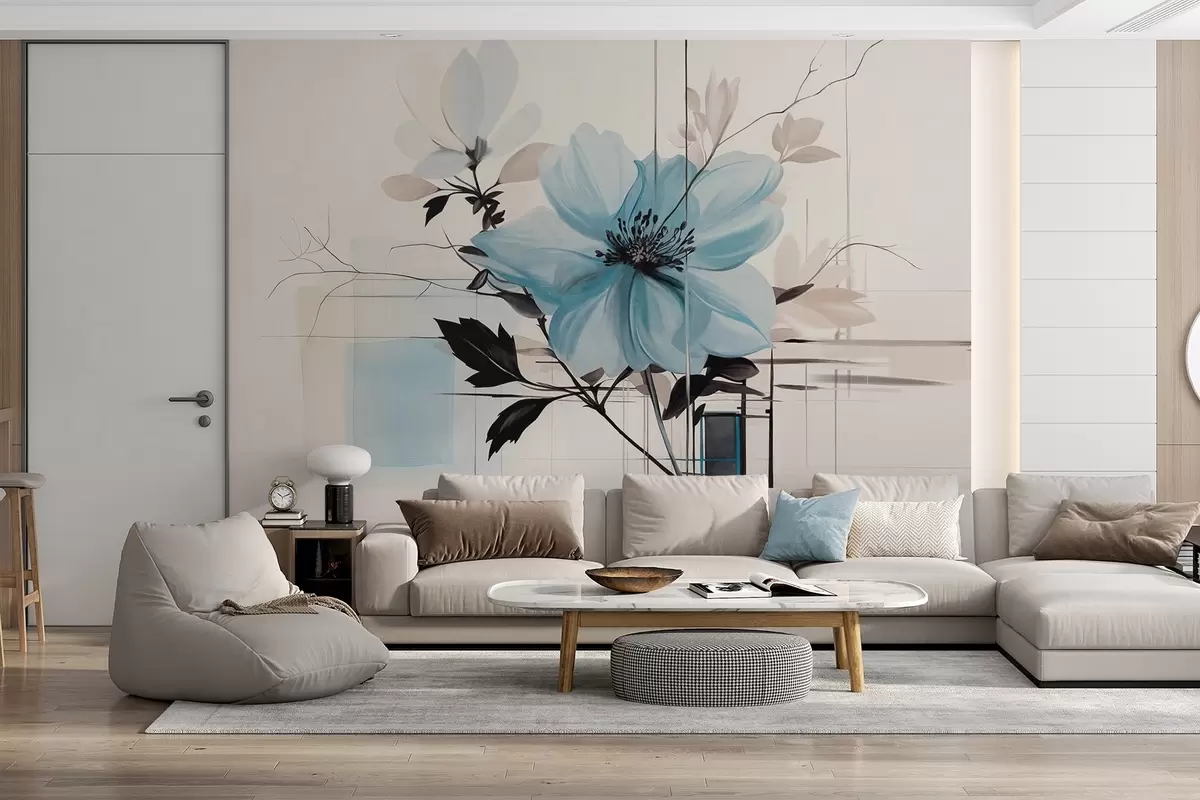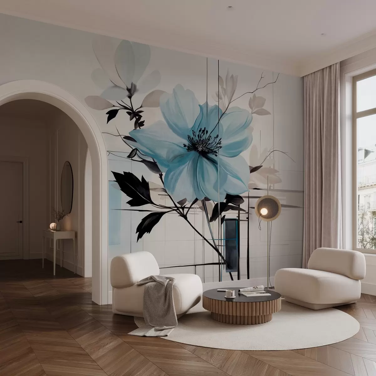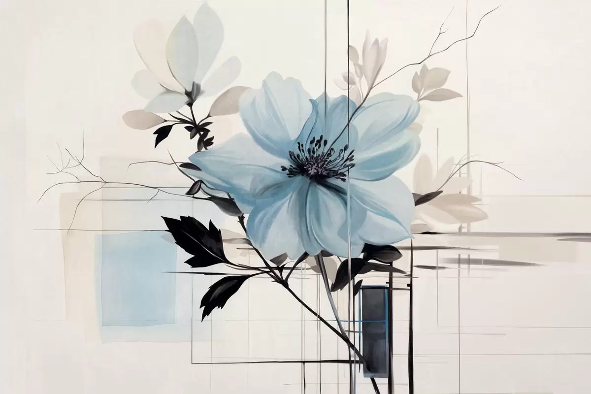 Carta da parati Fiore blu astratto con foglie e rami scuri, forme e linee geometriche minimaliste in colori tenui nr. w09332