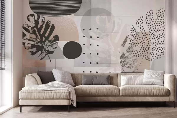 Carta da parati Stampa astratta con forme geometriche e foglie di monstera tropicale, cerchi, punti e linee, design moderno e minimalista nr. w09333