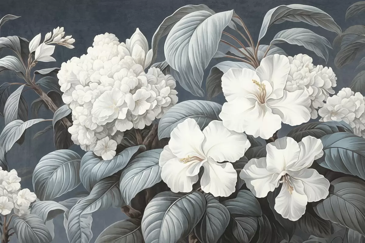 Carta da parati Fiori tropicali bianchi con petali e foglie delicate su sfondo blu scuro, stile vintage testurizzato, illustrazione botanica nr. w09334