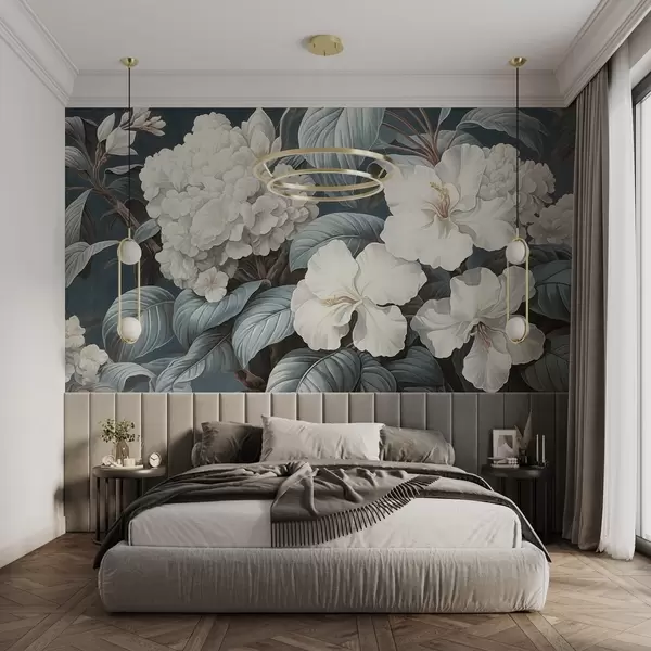 Carta da parati Fiori tropicali bianchi con petali e foglie delicate su sfondo blu scuro, stile vintage testurizzato, illustrazione botanica nr. w09334