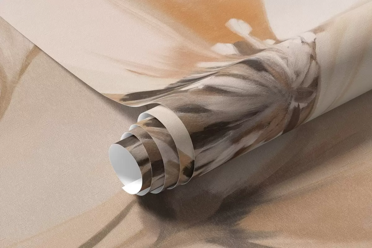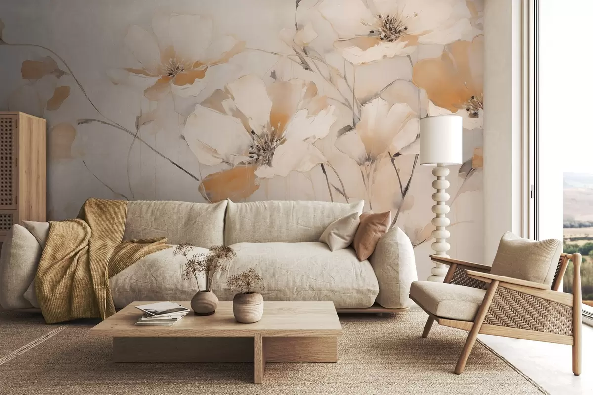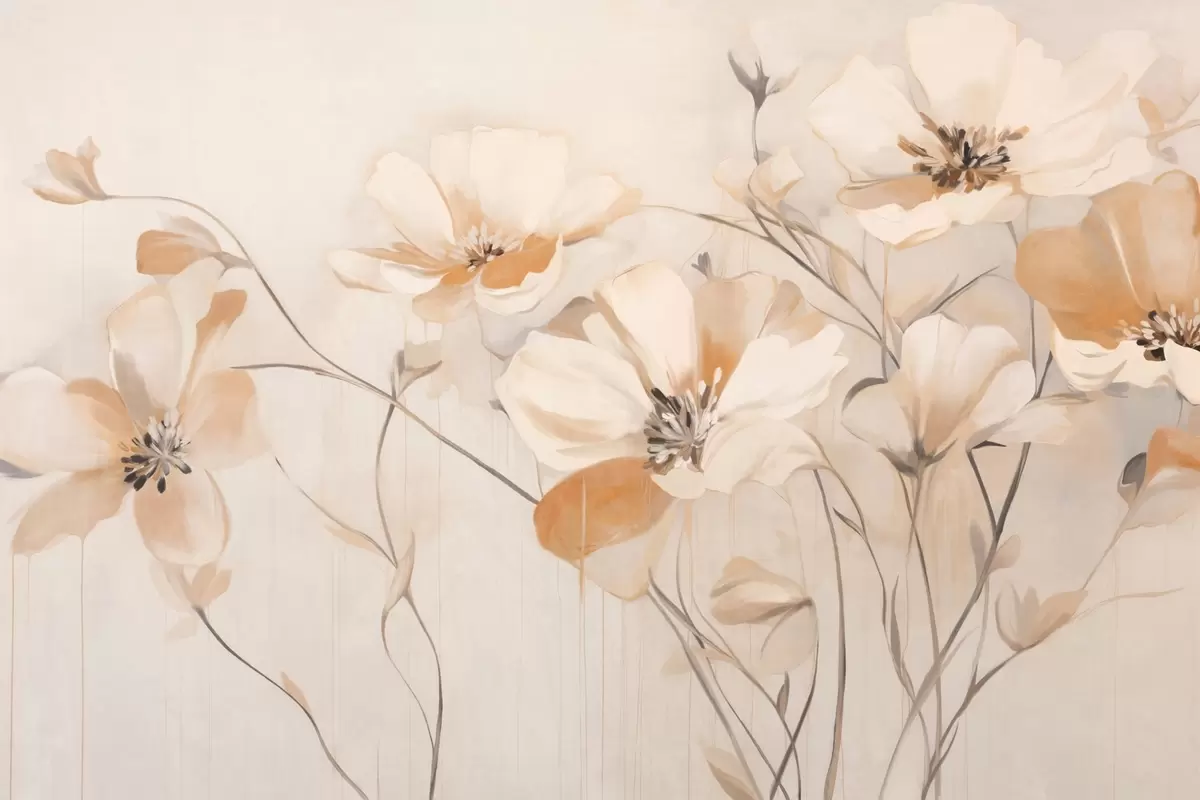 Carta da parati Fiori bianchi e arancioni con lunghi steli, sfondo chiaro, colori tenui, composizione elegante, pennellate delicate nr. w09335