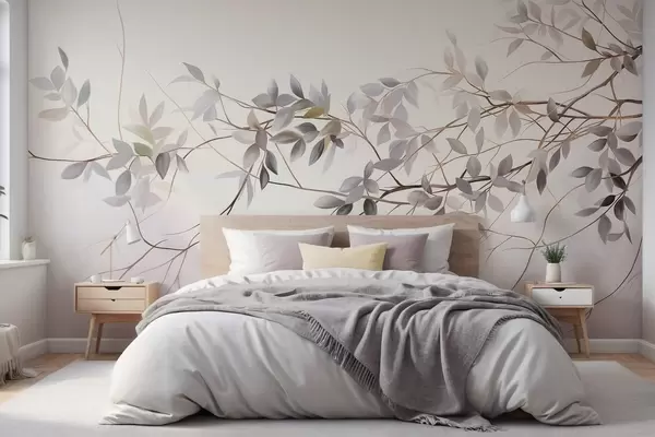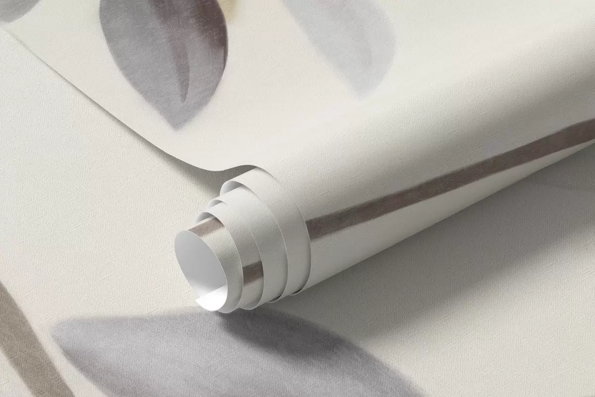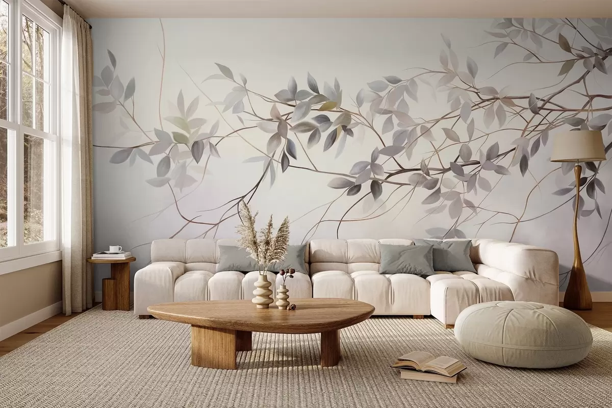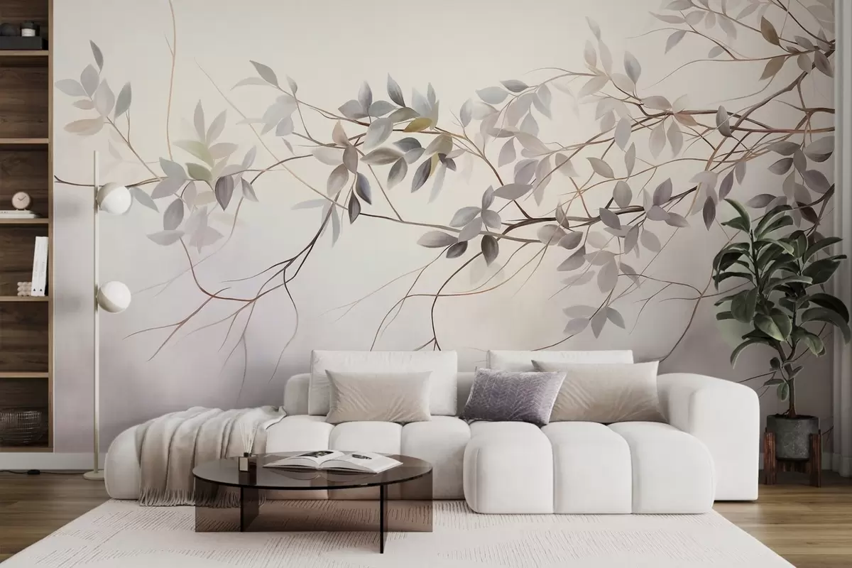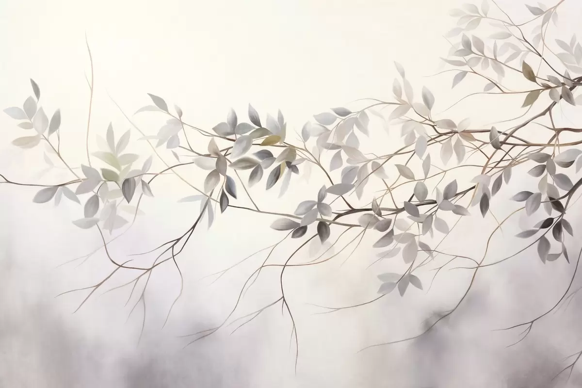 Carta da parati Rami dalla texture delicata con foglie dai toni tenui di grigio, viola e verde su uno sfondo morbido e sfocato. nr. w09336