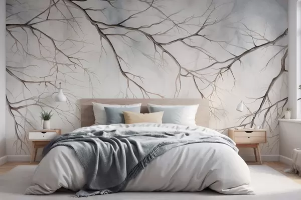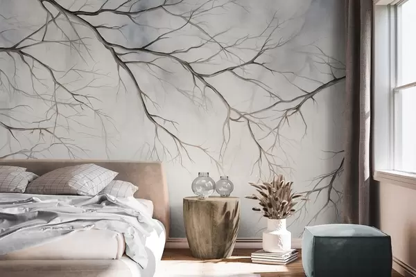 Carta da parati Rami di alberi con effetto acquerellato, dettagli intricati, tavolozza di colori tenui, su uno sfondo chiaro nr. w09337