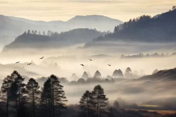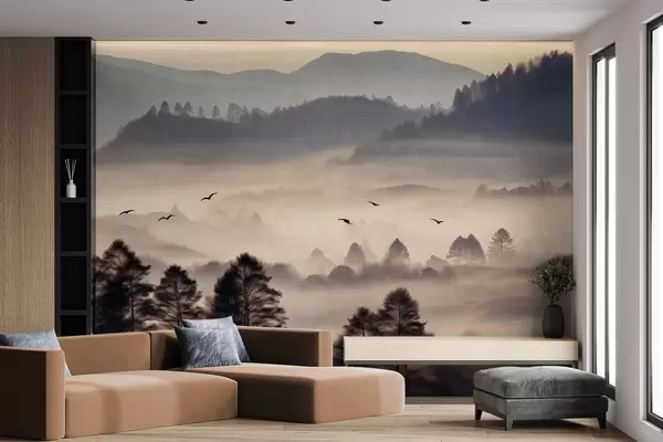 Carta da parati Paesaggio montano strutturato con strati di nebbia, alberi in primo piano, catena montuosa distante, illuminazione soffusa nr. w09338