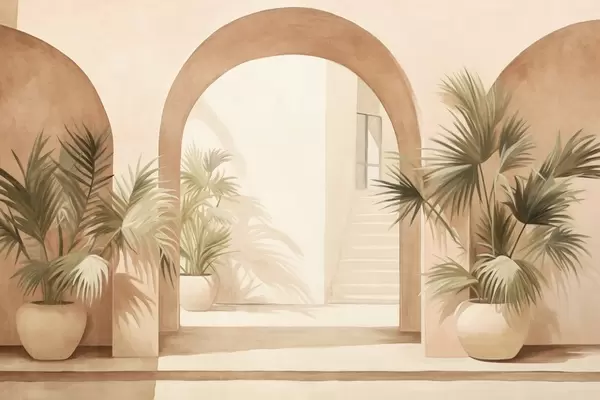 Carta da parati Archi strutturati con piante in vaso, palette di colori beige chiaro, design minimalista, scala sullo sfondo nr. w09339