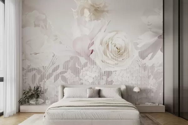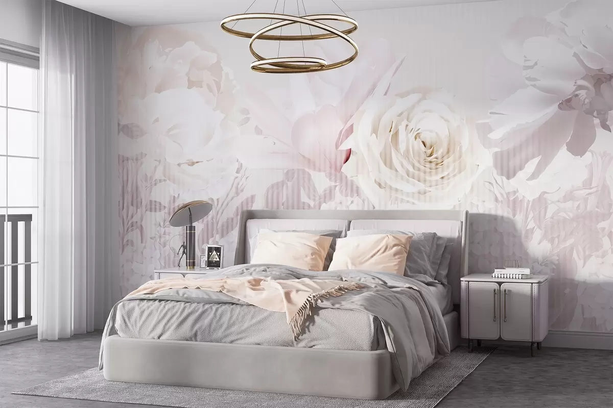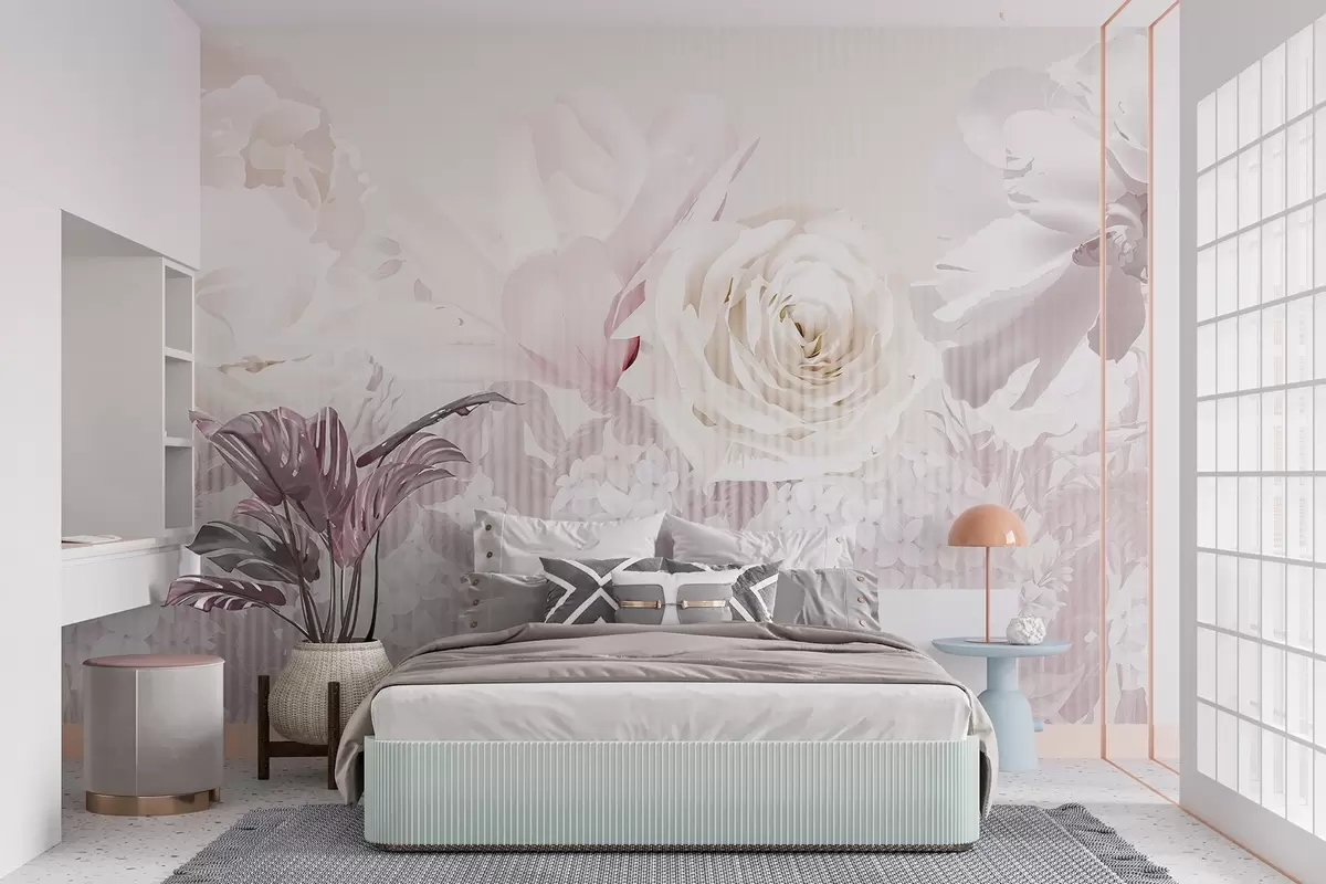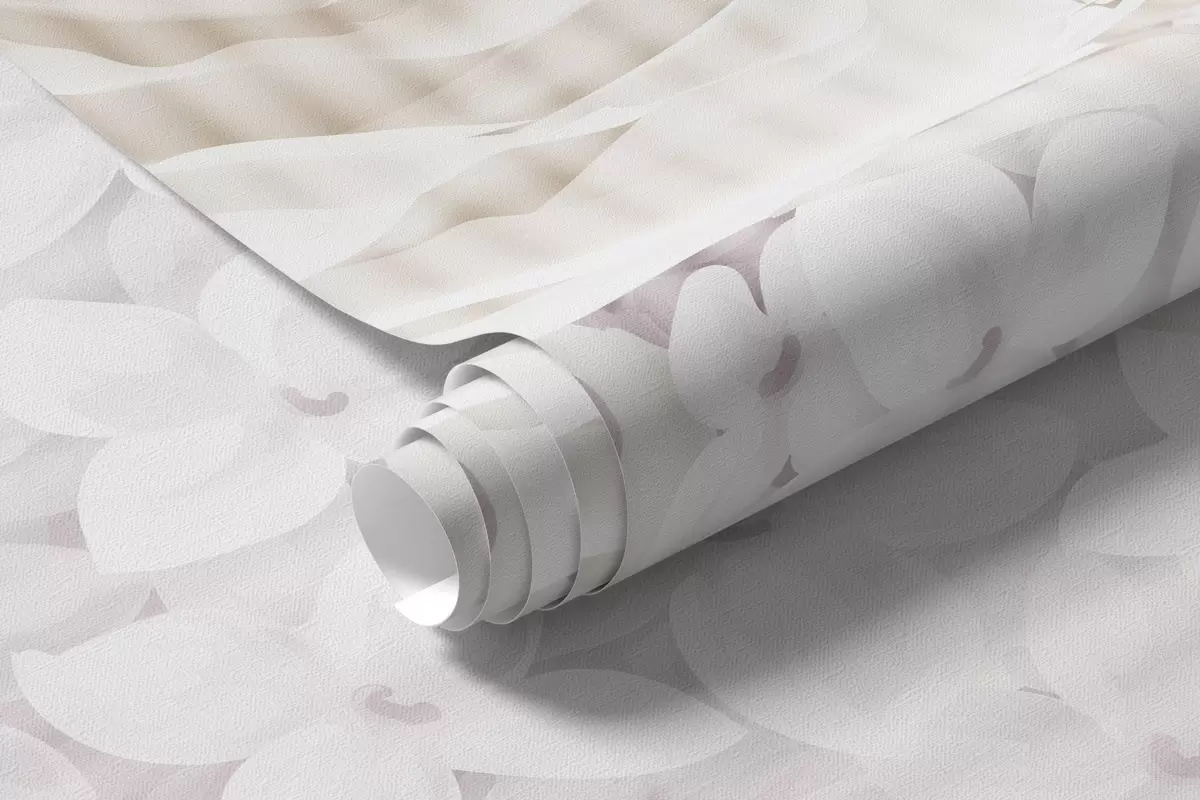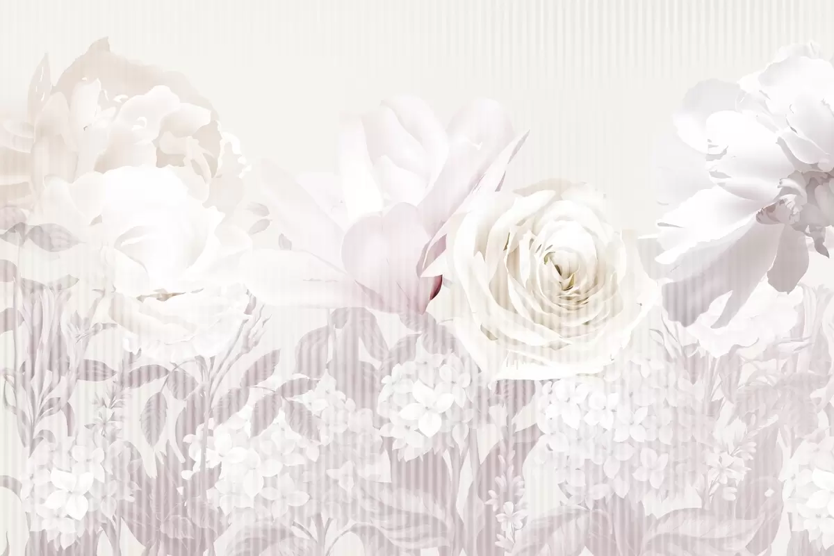 Carta da parati Composizione floreale con rose, ortensie e tulipani in morbide tonalità pastello di bianco, rosa e beige, con texture a righe nr. w09340