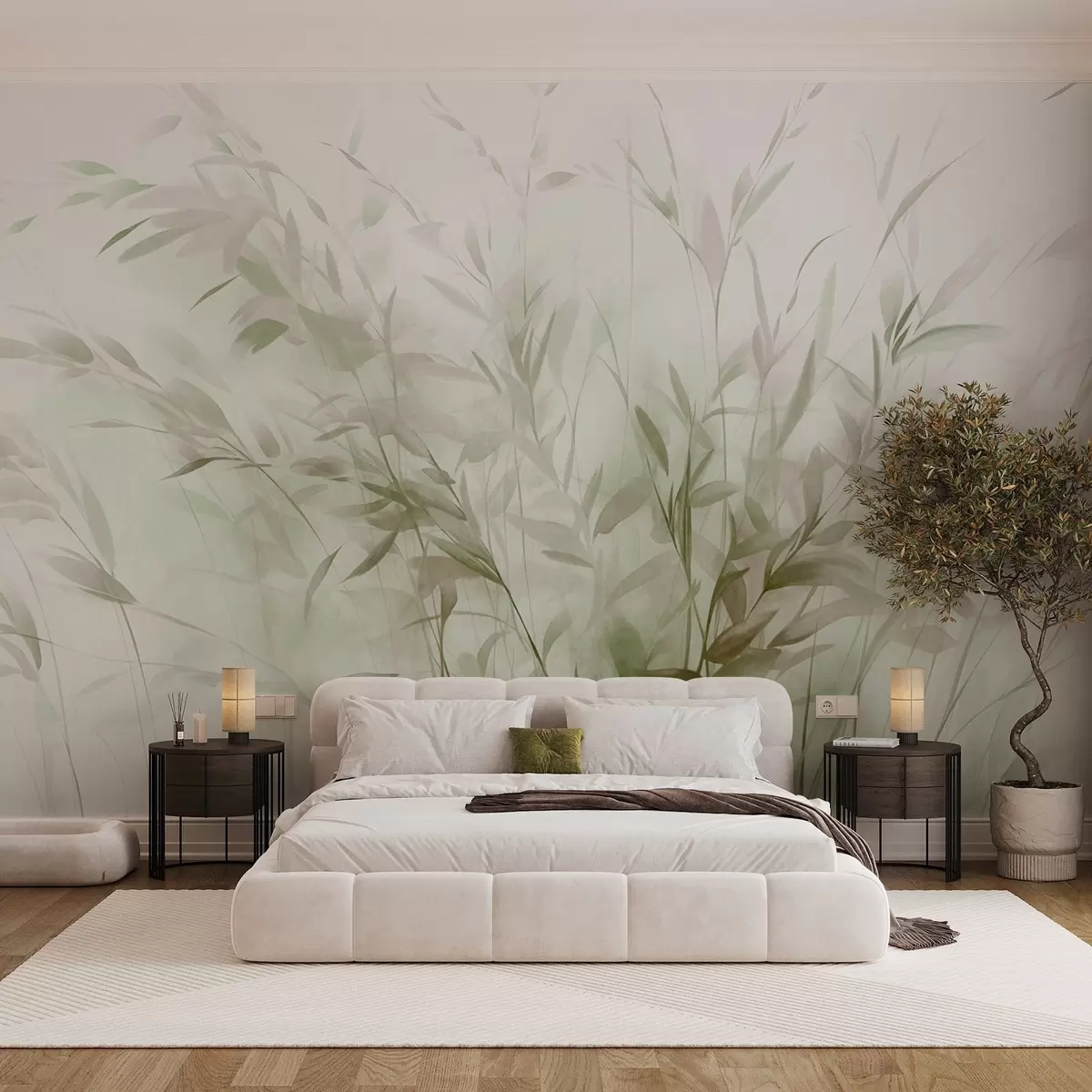 Carta da parati Erba ed erbacce con foglie e steli sottili, colori verde chiaro e marrone, pennellate morbide e delicate, stampa minimalista nr. w09342