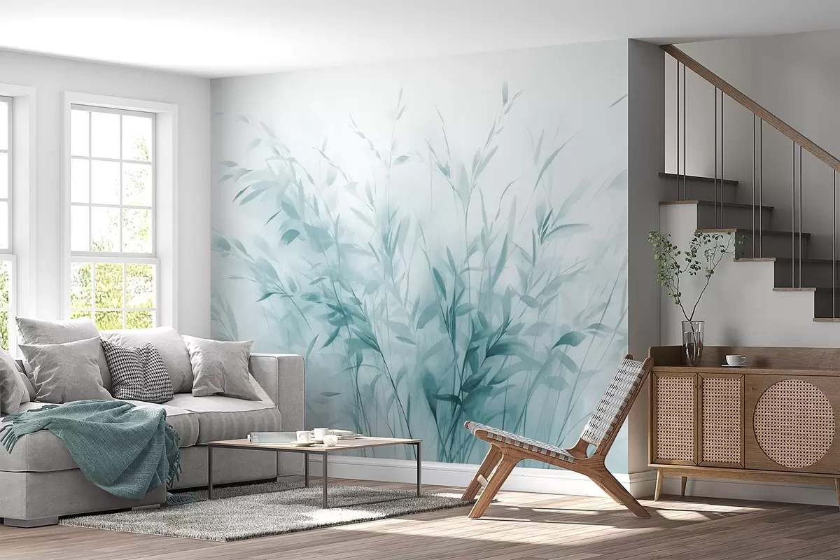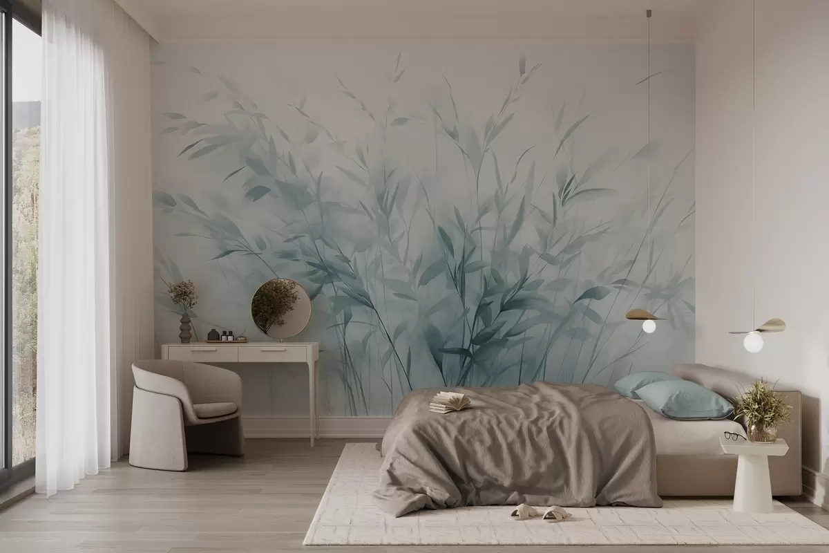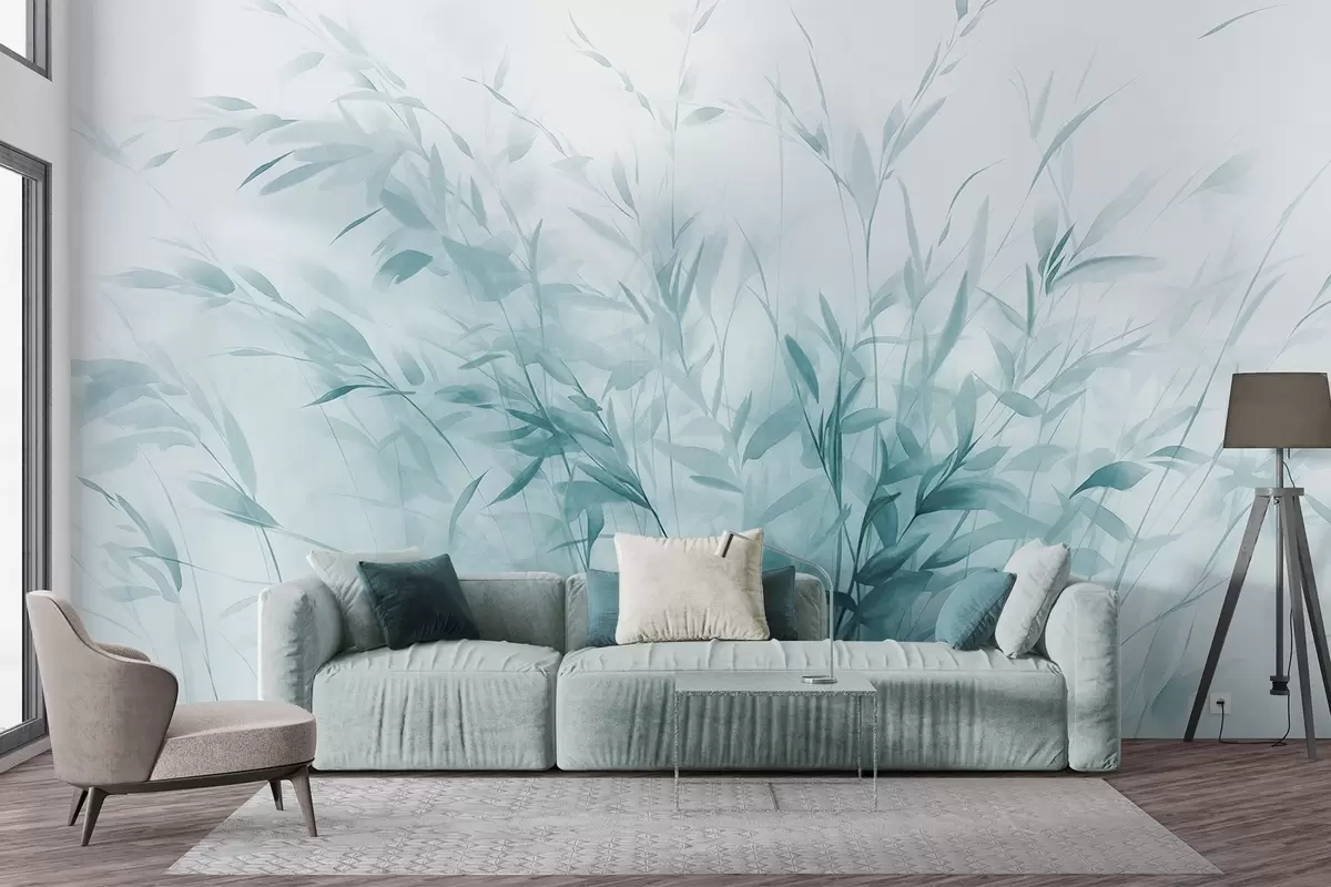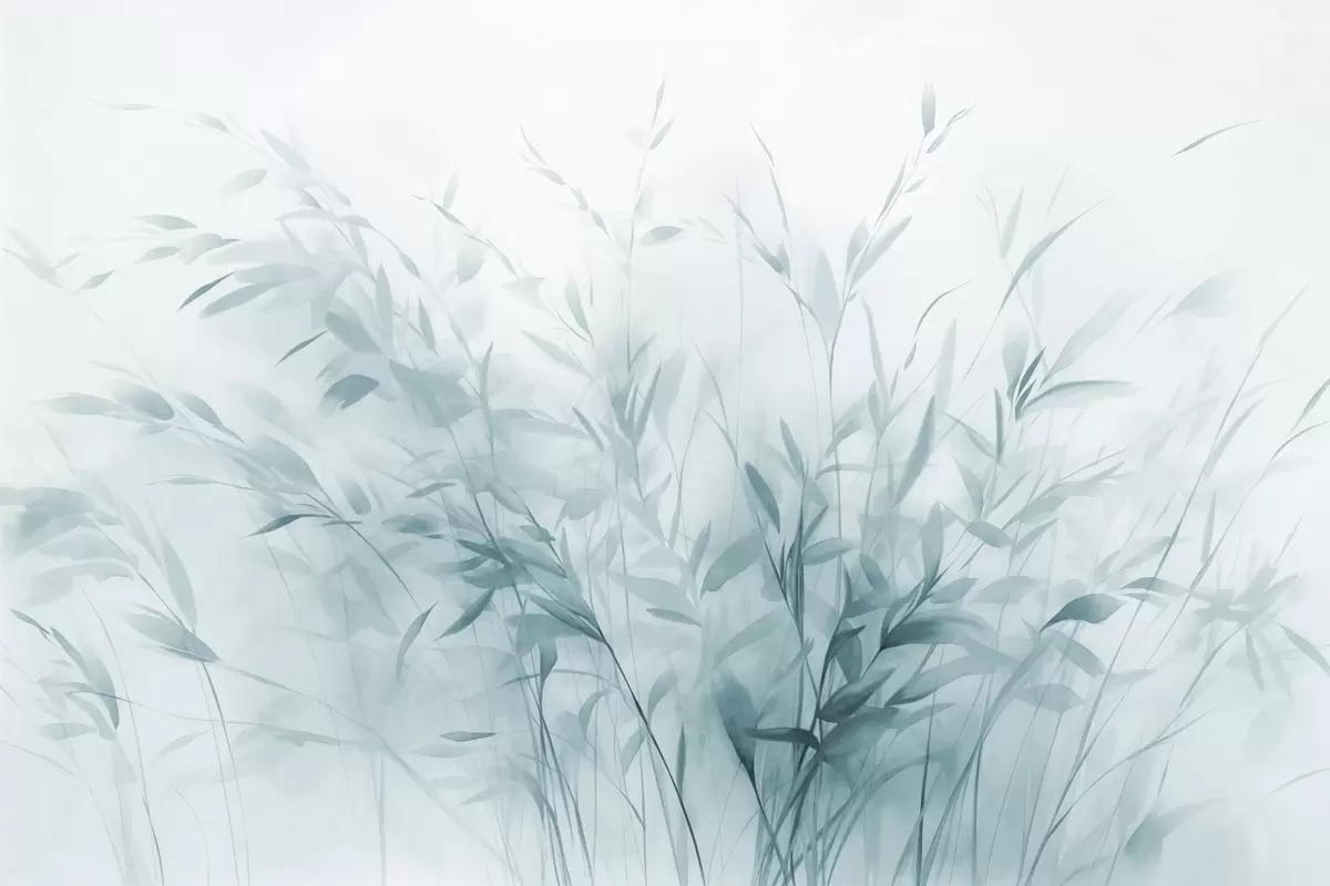 Carta da parati Erba ed erbacce con foglie e steli sottili, colori blu chiaro, pennellate morbide e delicate, stampa minimalista nr. w09342v1