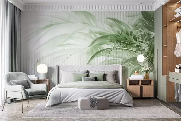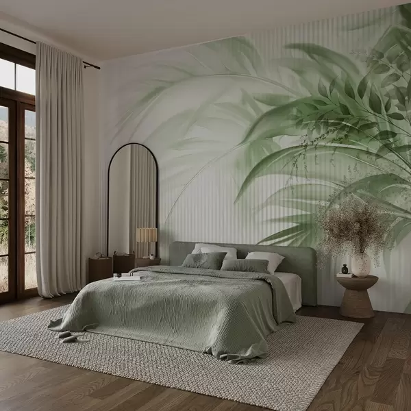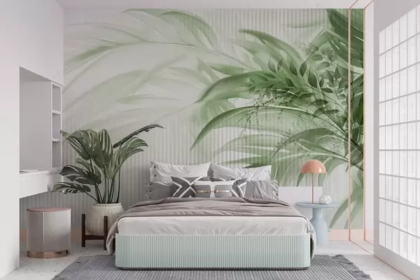 Carta da parati Foglie verdi di palma tropicale con sfondo a strisce bianche, illuminazione soffusa, pennellate delicate, forme organiche nr. w09343