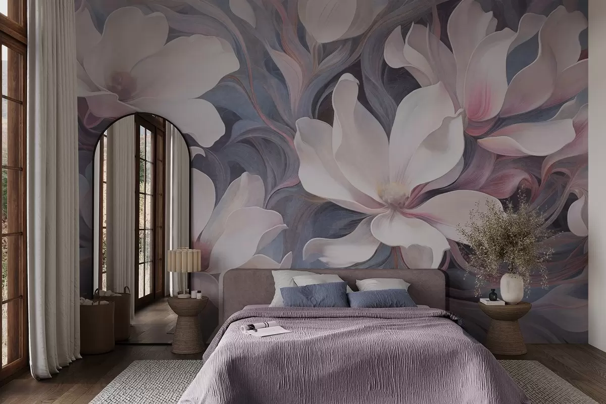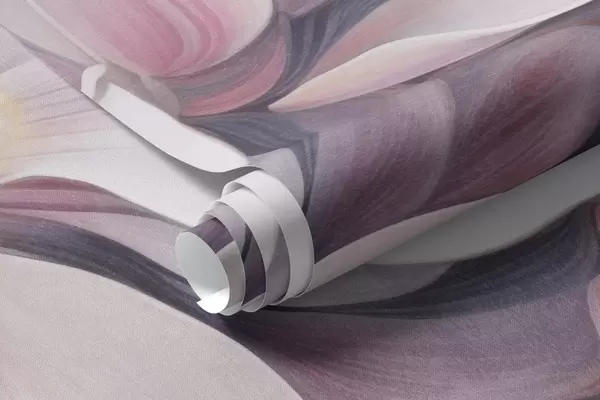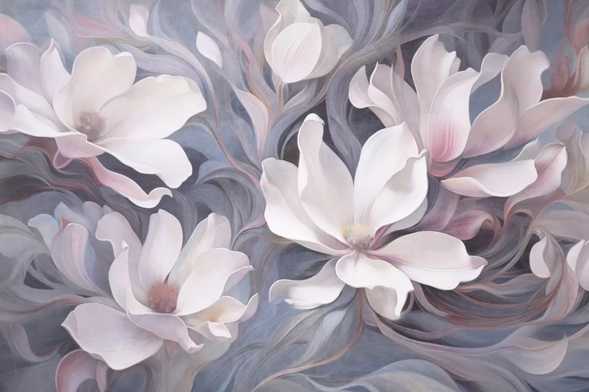 Carta da parati Quadro strutturato di fiori di magnolia bianchi con accenti rosa, su uno sfondo di tonalità blu e grigie tenui e vorticose nr. w09344