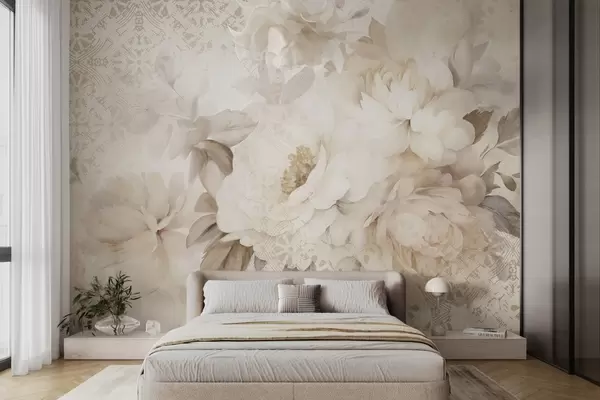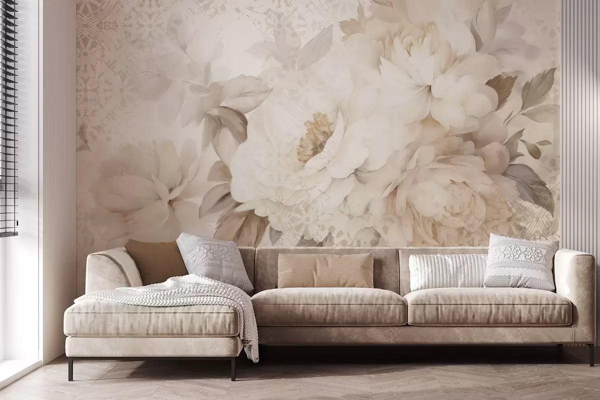 Carta da parati Composizione floreale di peonie bianche con foglie beige, su uno sfondo decorativo con texture vintage nr. w09345