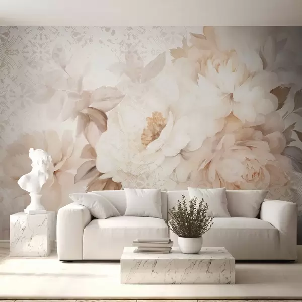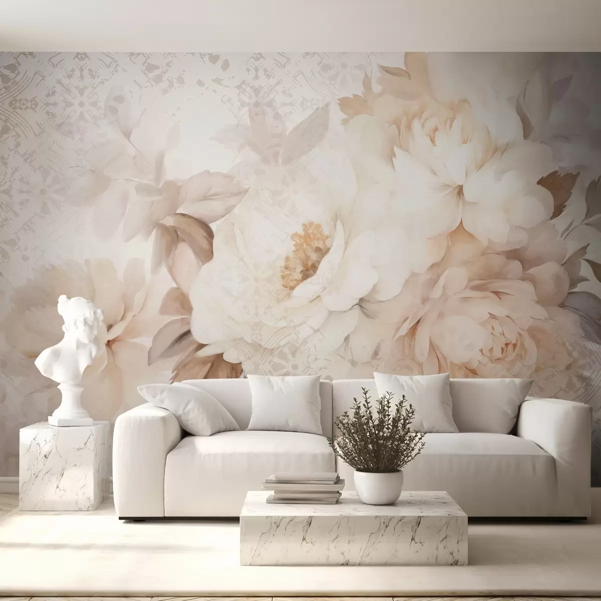 Carta da parati Composizione floreale di peonie bianche con foglie beige, su uno sfondo decorativo con texture vintage nr. w09345