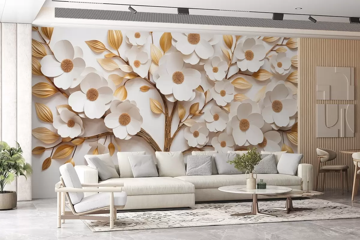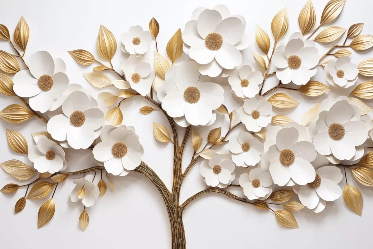 Carta da parati Albero con fiori bianchi e imitazione di foglie in rilievo nr. w09348