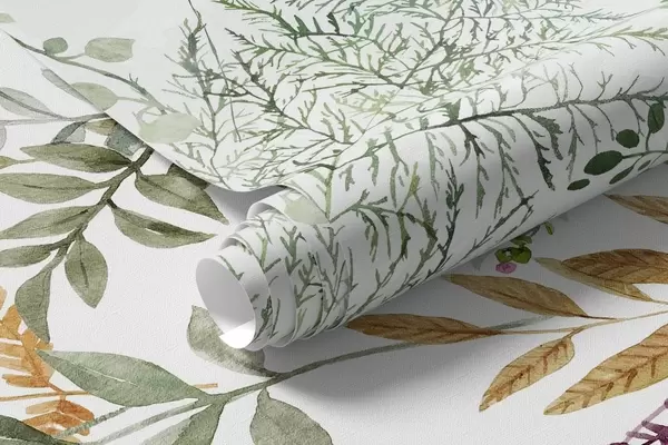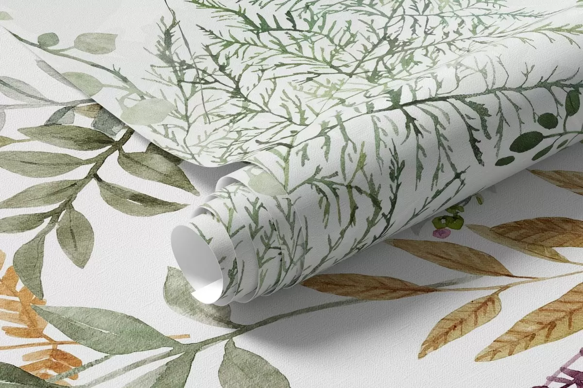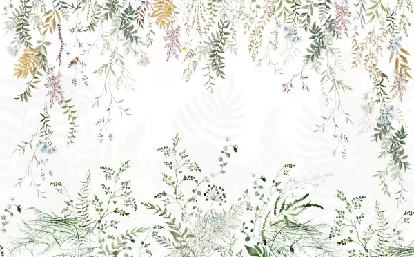Carta da parati Illustrazione botanica con felci, erba e piante pendenti, toni pastello, su sfondo bianco stile acquerello testurizzato nr. w09364