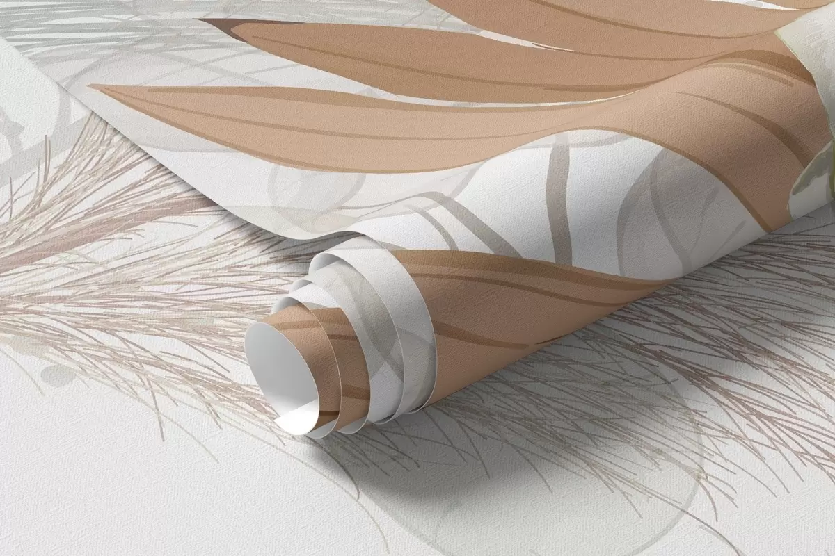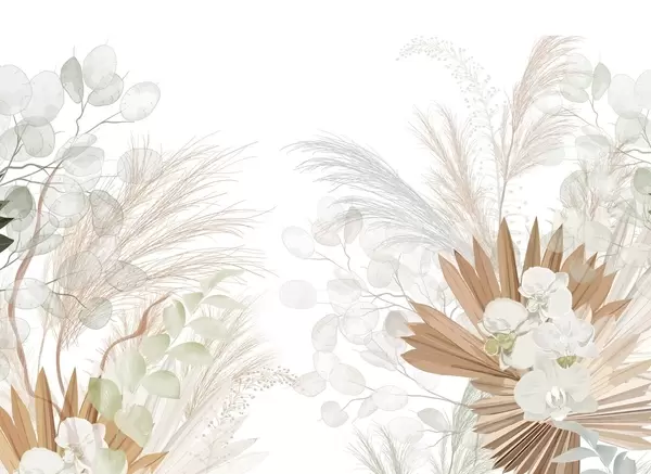 Carta da parati Erba della Pampa, eucalipto, foglie tropicali e orchidee su sfondo bianco, colori pastello nr. w09366
