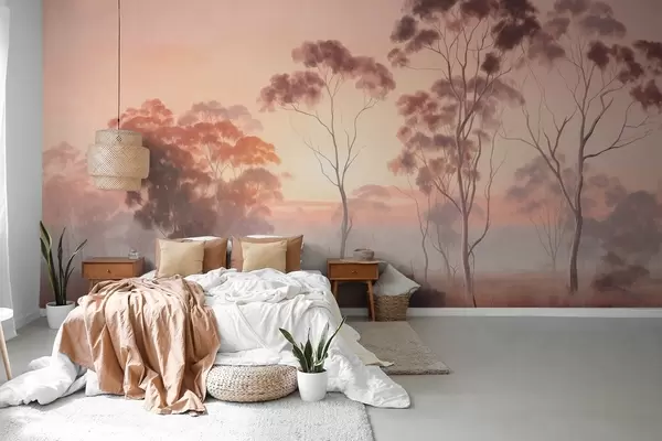 Carta da parati Un paesaggio con alberi di eucalipto in un campo con cielo rosa pastello e arancione, una leggera nebbia, pittura in stile texture nr. w09367