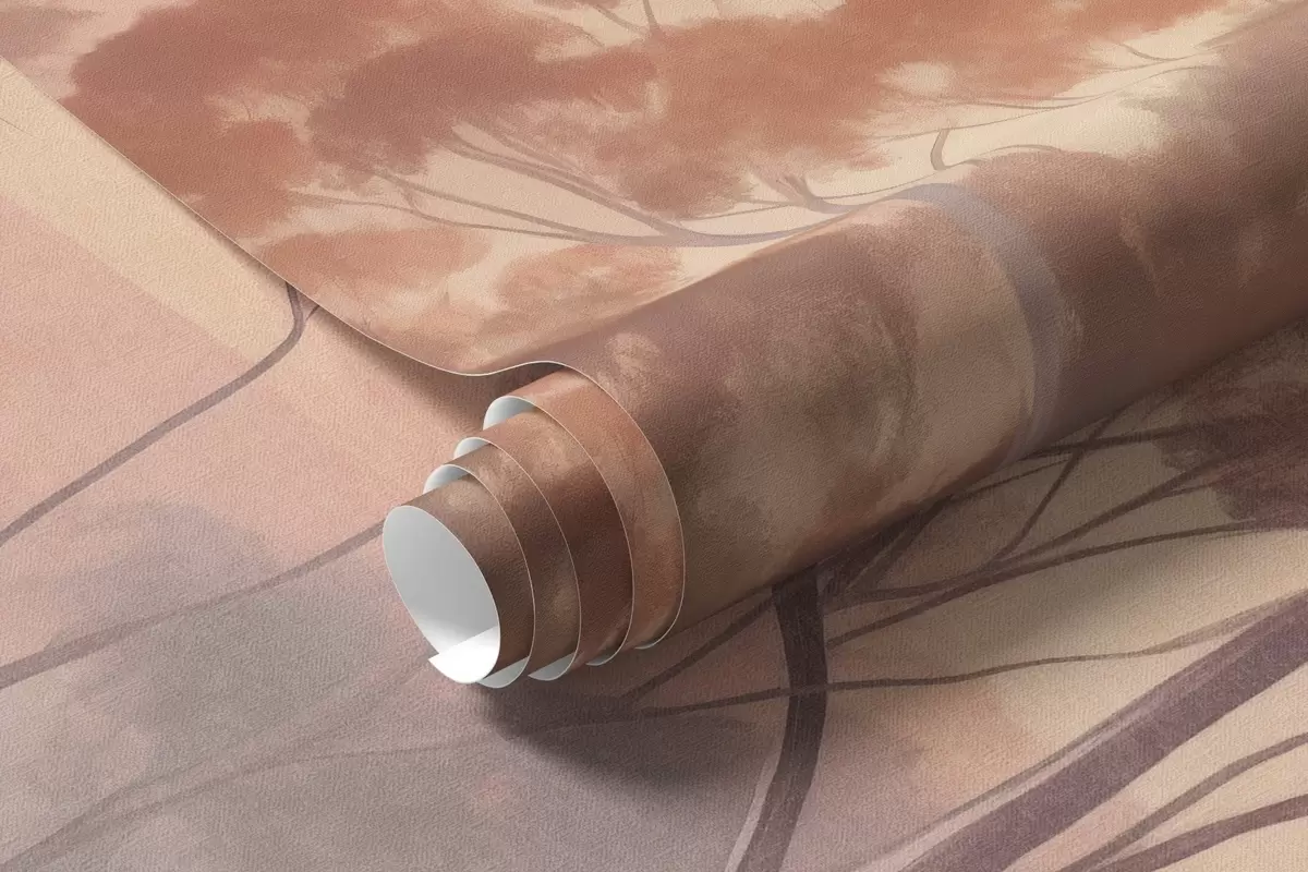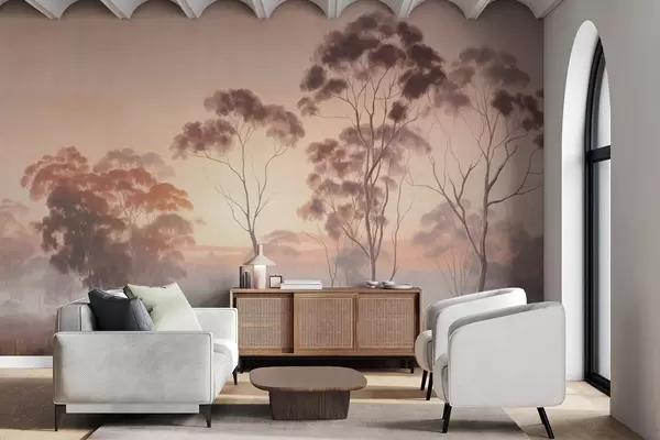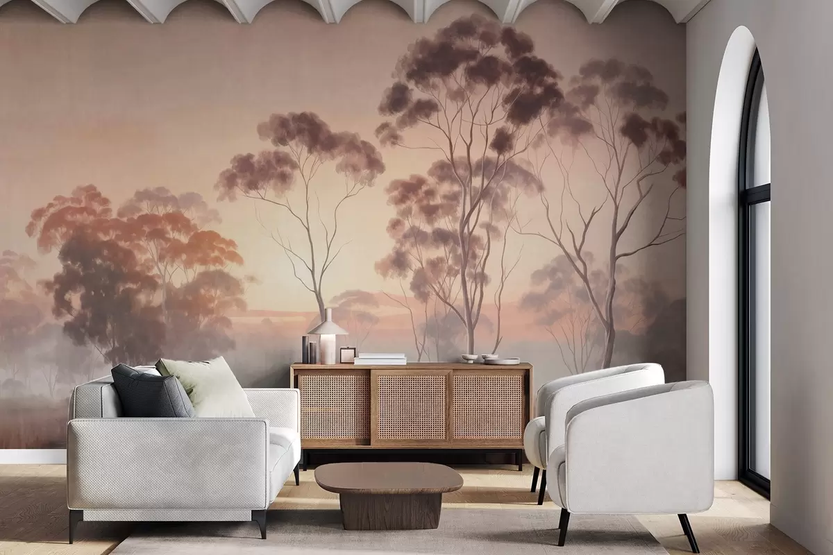 Carta da parati Un paesaggio con alberi di eucalipto in un campo con cielo rosa pastello e arancione, una leggera nebbia, pittura in stile texture nr. w09367