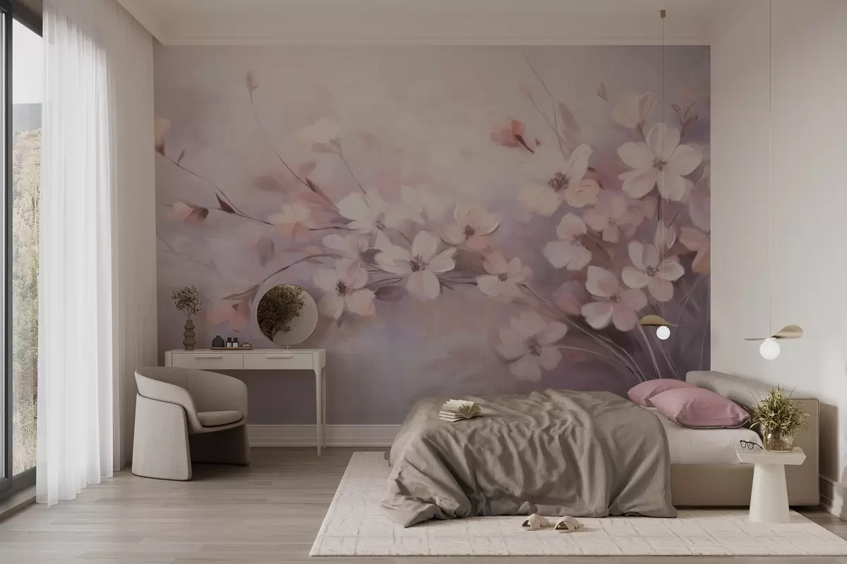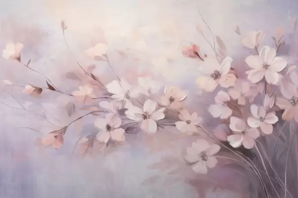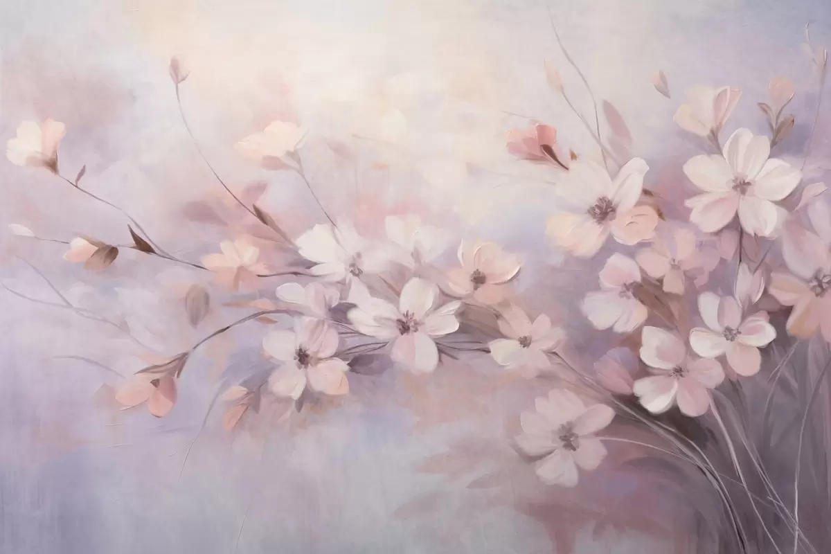 Carta da parati Una composizione floreale con fiori delicati dai bordi morbidi e sfumati, su uno sfondo pastello dalle tonalità lavanda e rosa chiaro nr. w09369