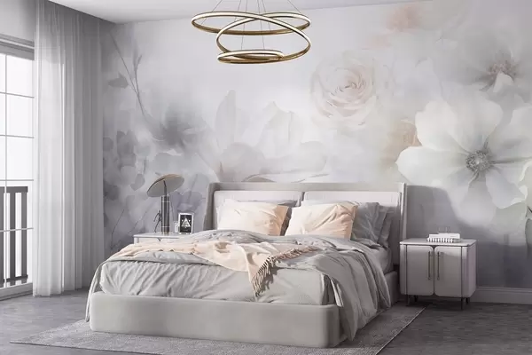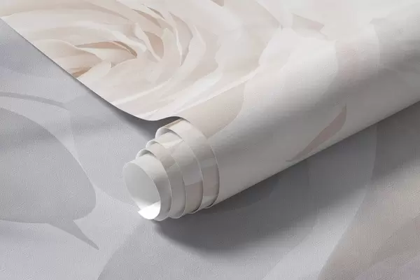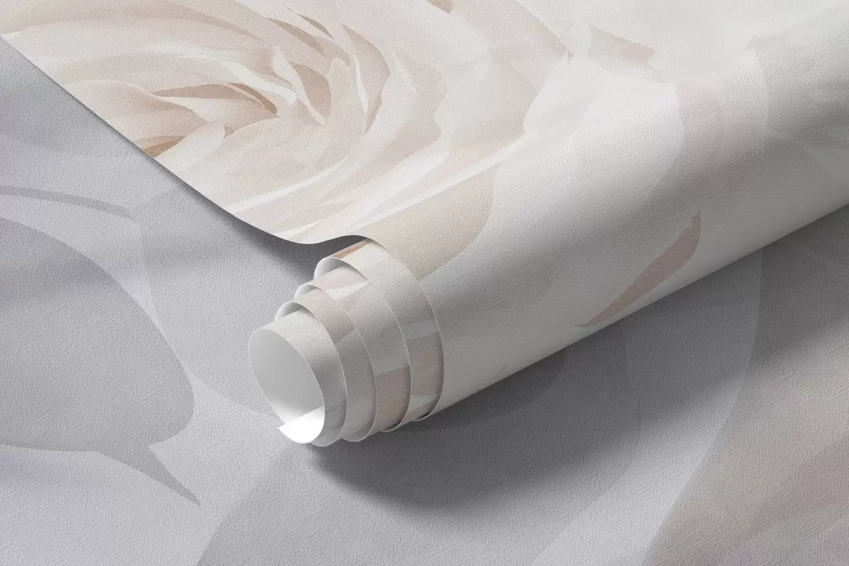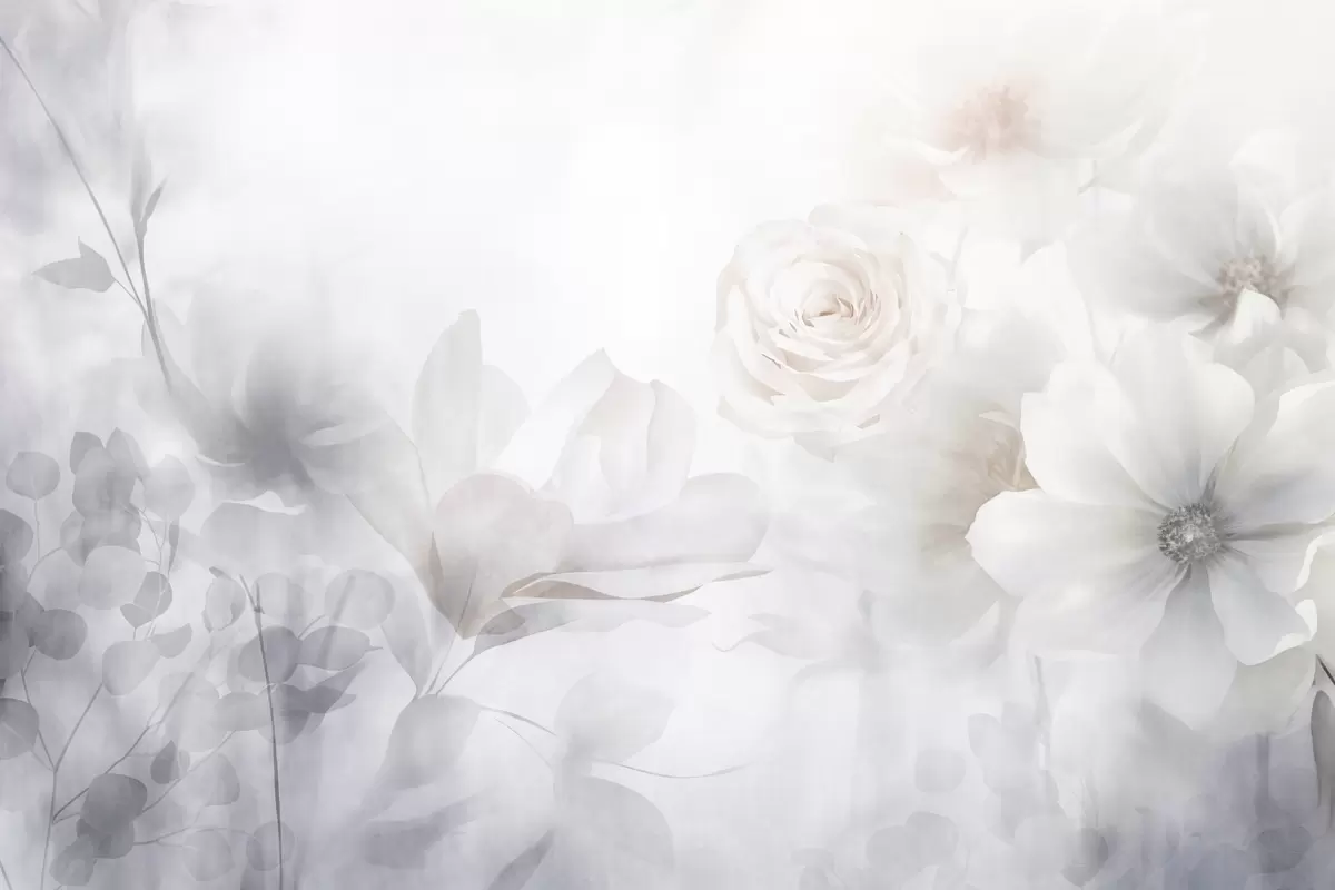 Carta da parati Una delicata composizione floreale astratta con rose rosa pastello e magnolie, messa a fuoco morbida, sfondo grigio chiaro nr. w09371