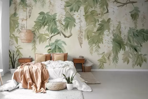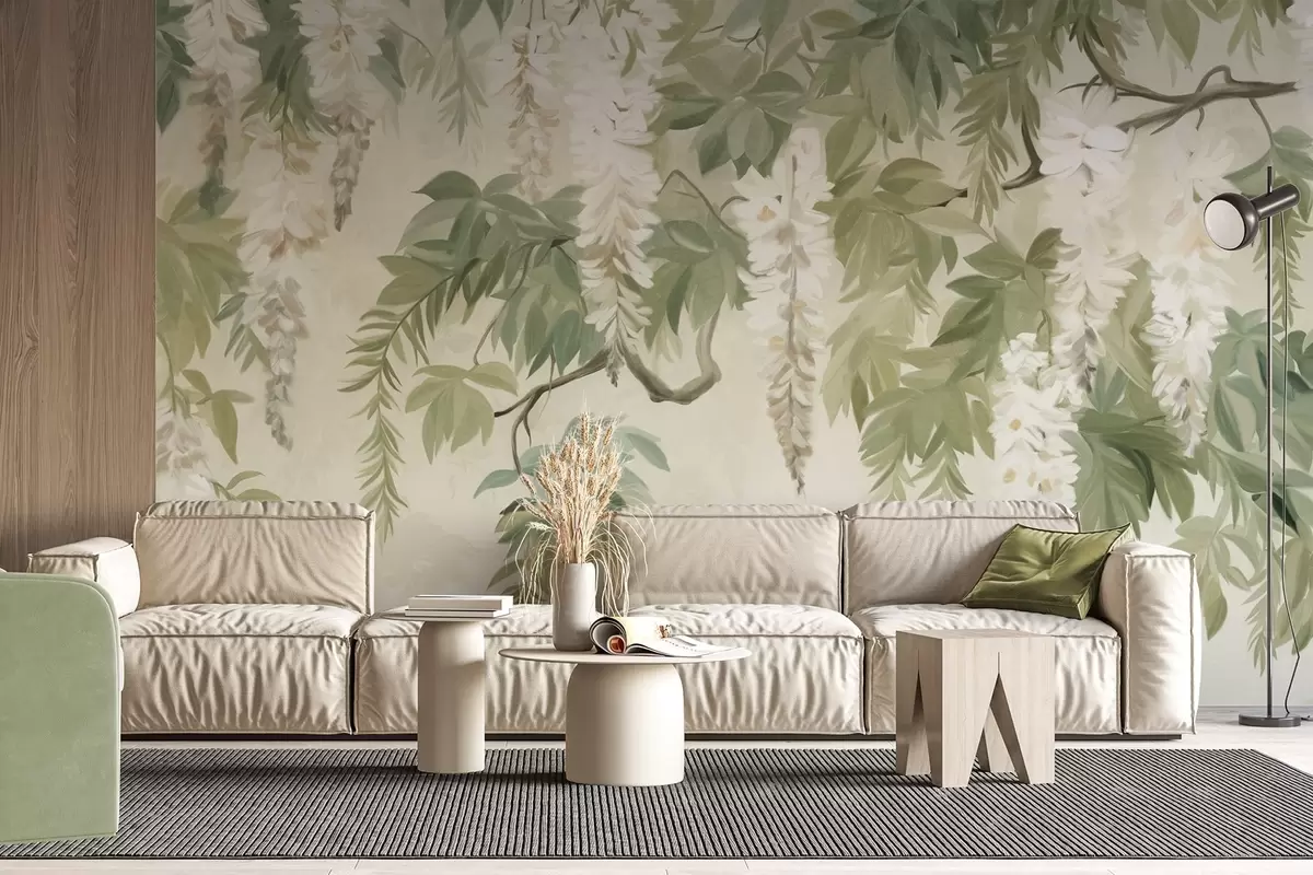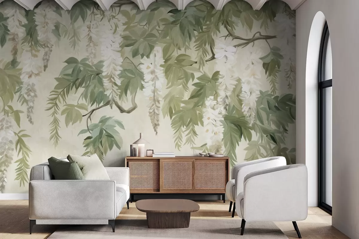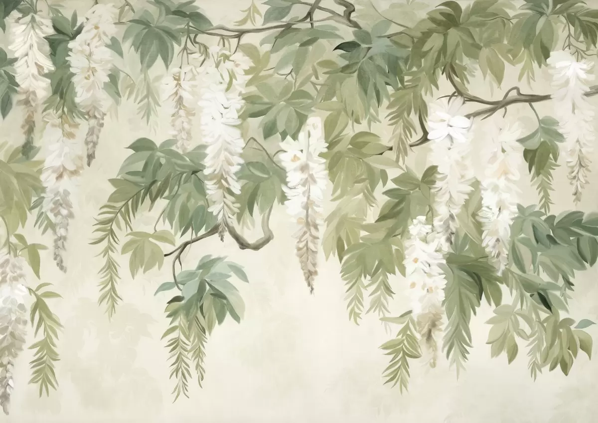 Carta da parati Rami di glicine con fiori bianchi e foglie verdi, sfondo verde, stile pittura vintage testurizzata nr. w09375