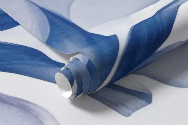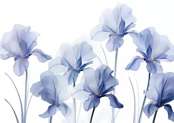 Carta da parati Fiori di iris blu con petali traslucidi e lunghi steli, disposti in fila su uno sfondo blu, morbido e strutturato nr. w09379