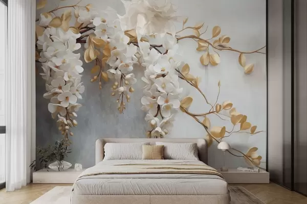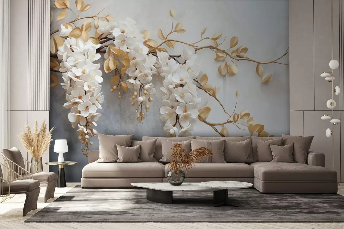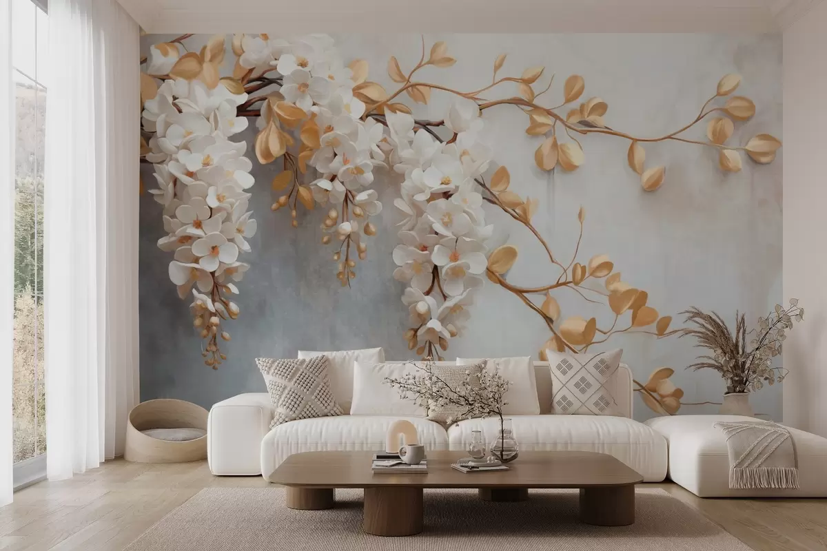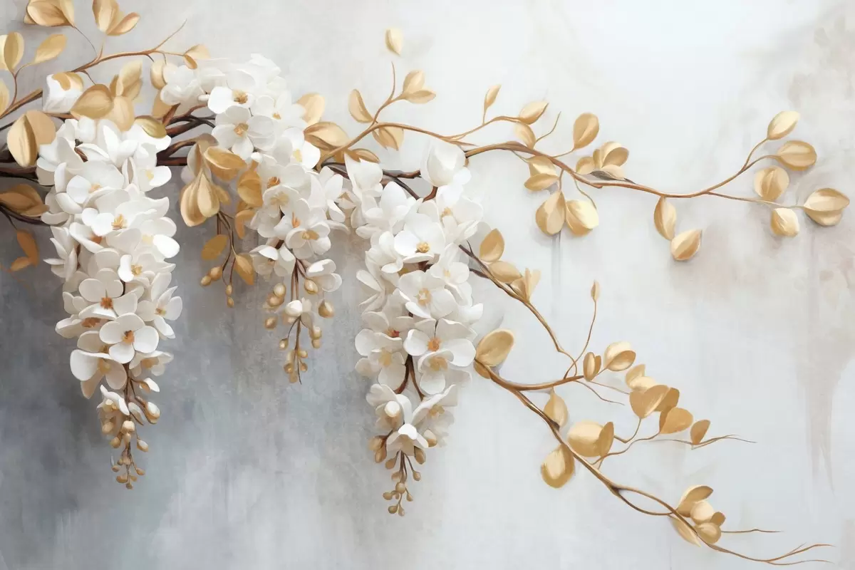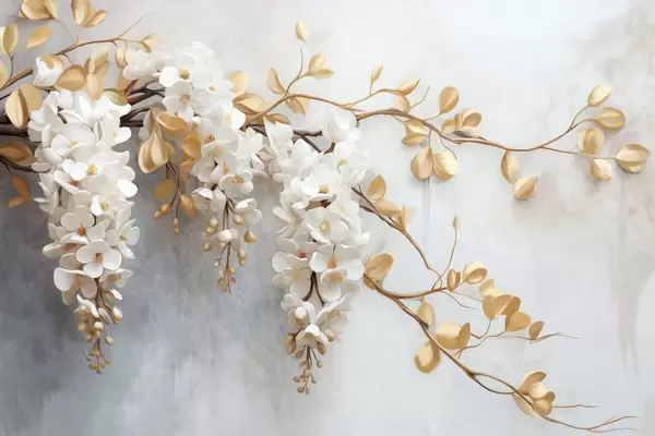 Carta da parati Fiori di glicine bianco con foglie gialle su un ramo, che scendono a cascata su uno sfondo bianco strutturato, petali delicati nr. w09381