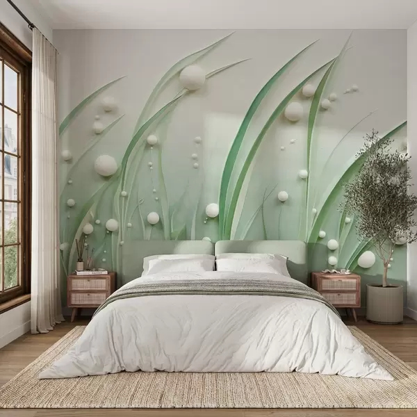 Carta da parati Erba verde astratta con sfere bianche, sfondo verde chiaro, texture, linee pulite, stile minimalista nr. w09382
