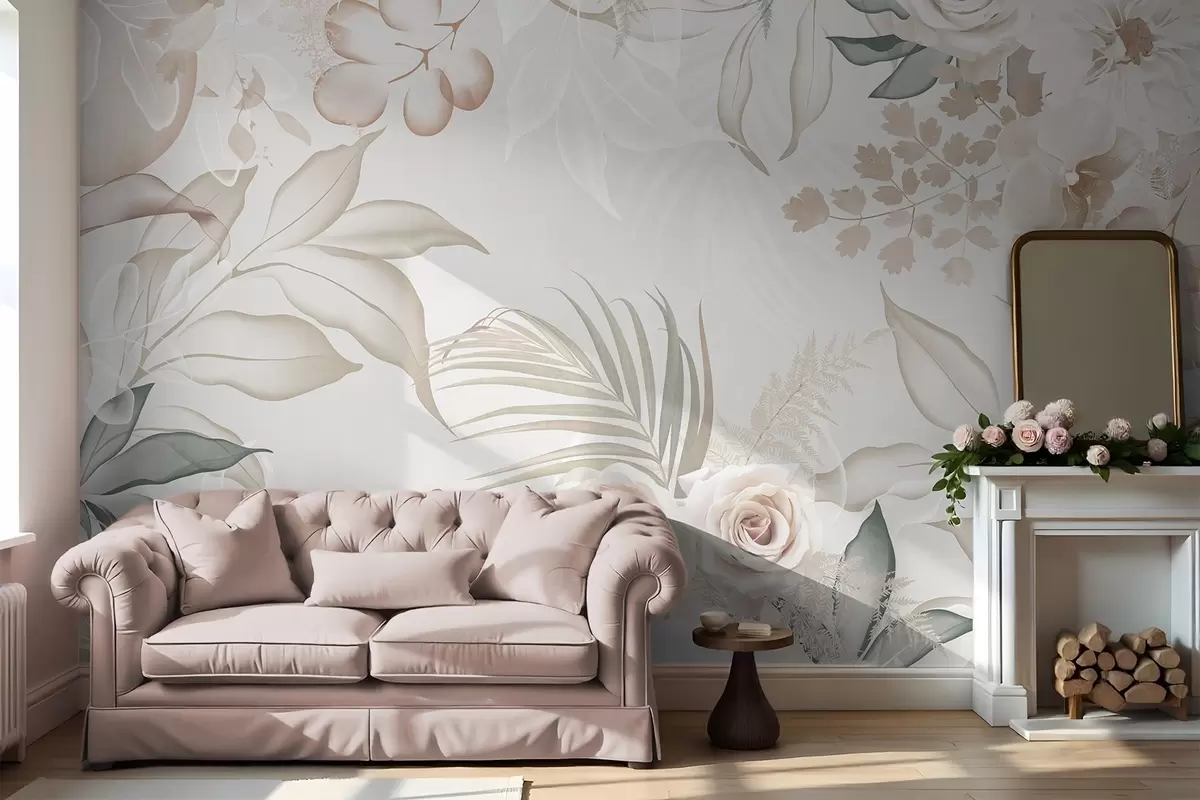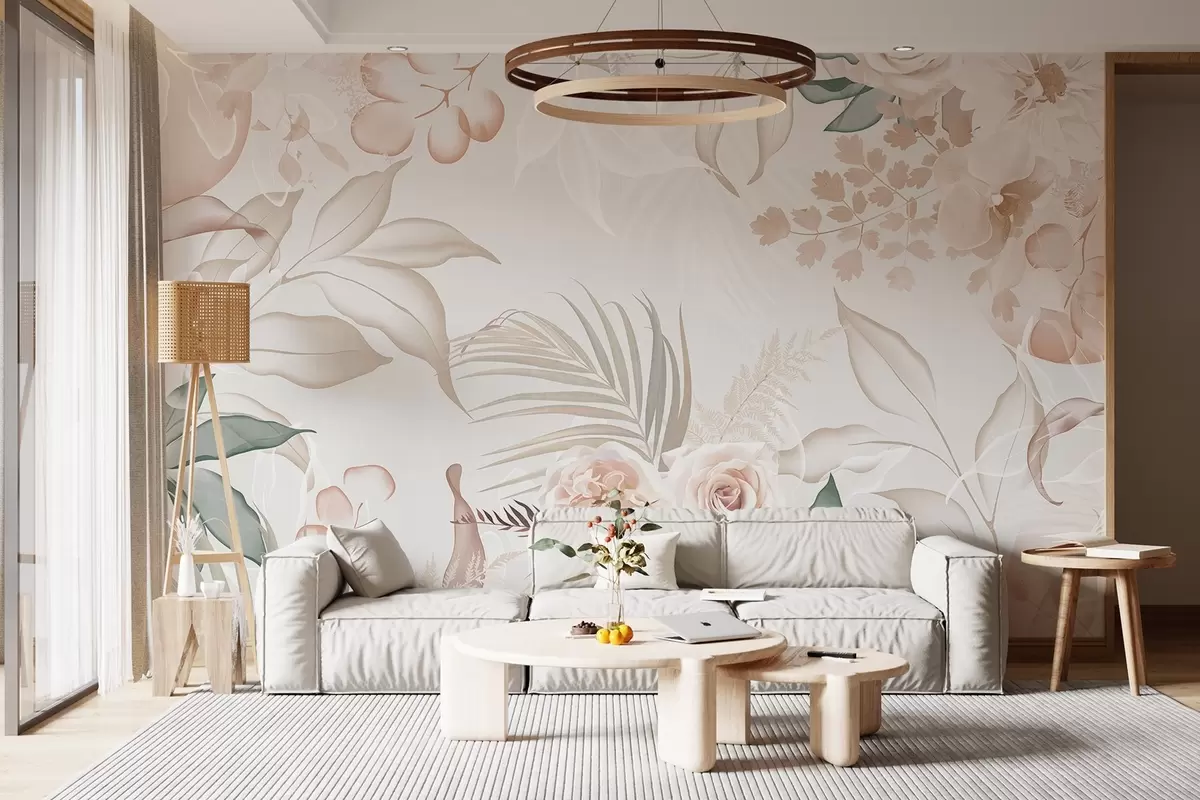 Carta da parati Composizione floreale con rose, orchidee, eucalipto e foglie di palma in colori pastello, sfondo beige nr. w09393