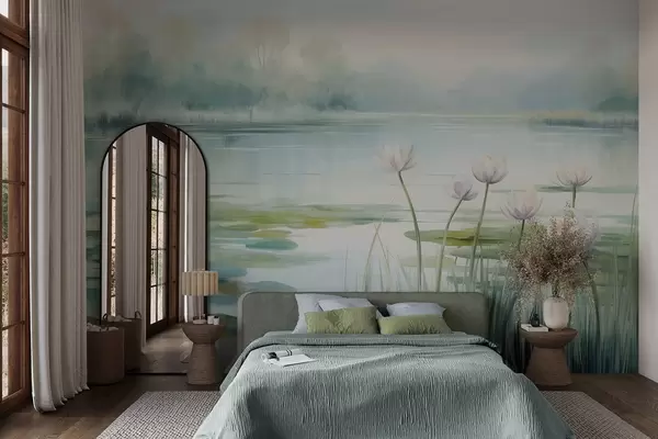 Carta da parati Paesaggio con un lago, ninfee e foglie di ninfea, alberi sullo sfondo, in un ambiente tranquillo, tonalità di azzurro e verde nr. w09395