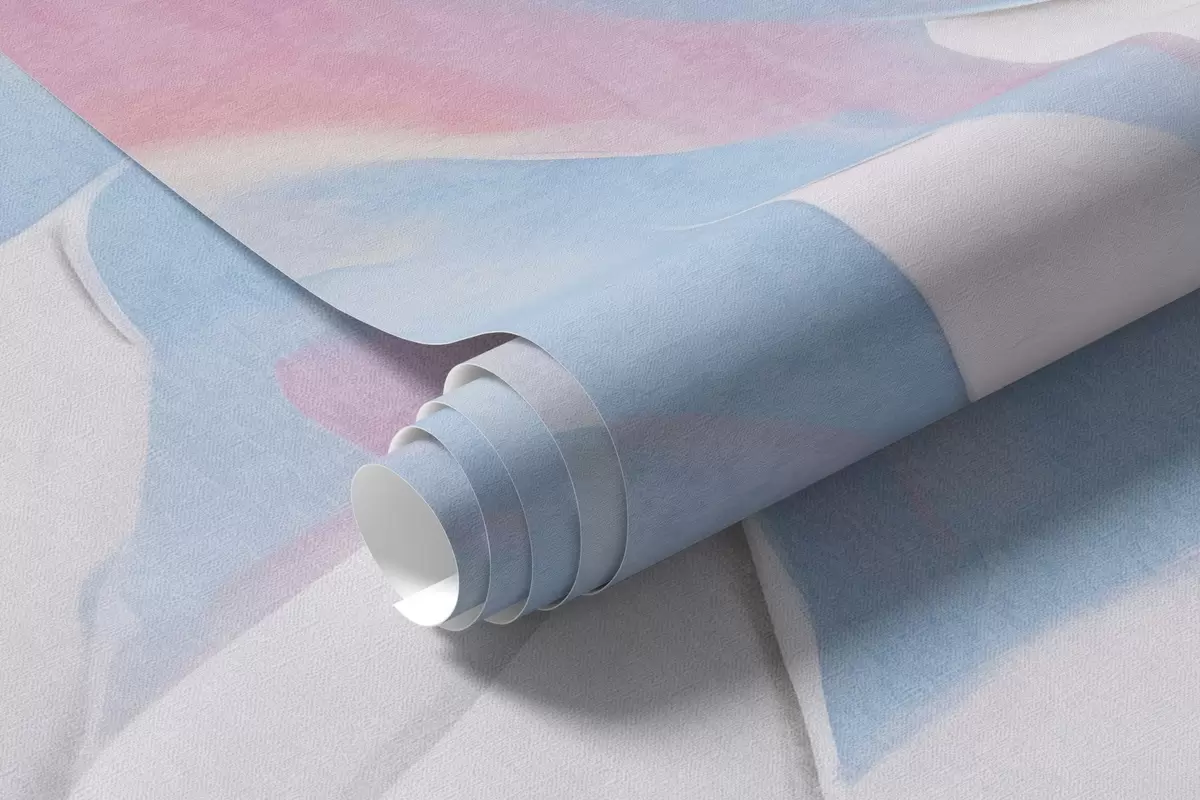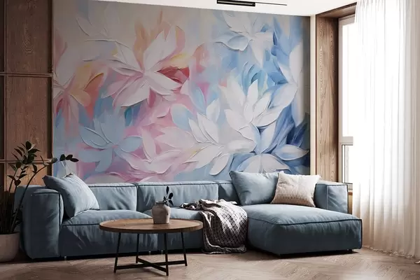 Carta da parati Fiori bianchi con texture e foglie rosa e blu, stile astratto a olio, pennellate morbide, colori pastello nr. w09396