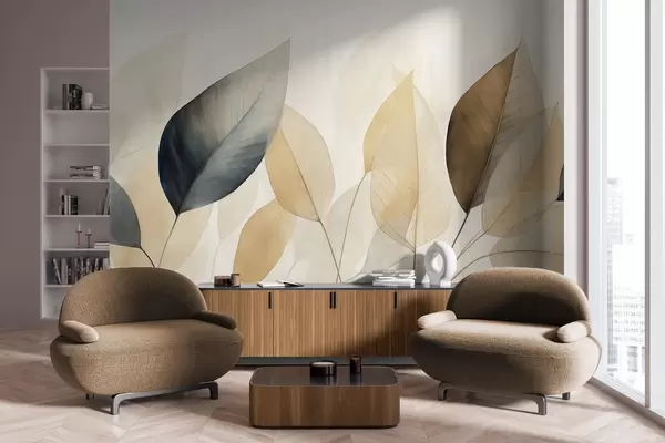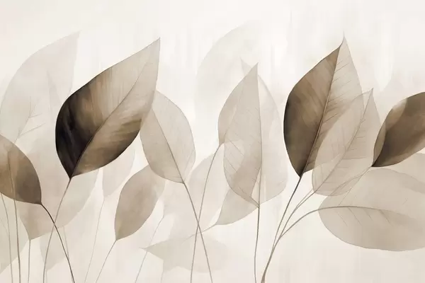 Carta da parati Dipinto materico che imita foglie nei toni del marrone, giallo e grigio, con delicate venature e steli nr. w09400