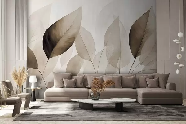 Carta da parati Dipinto materico che imita foglie nei toni del marrone e del beige con delicate venature e steli nr. w09400v1
