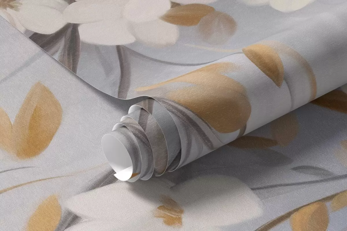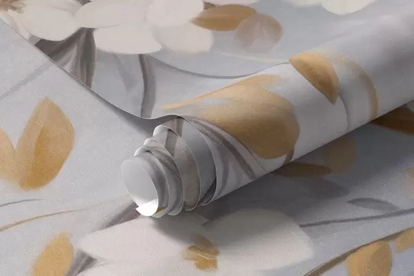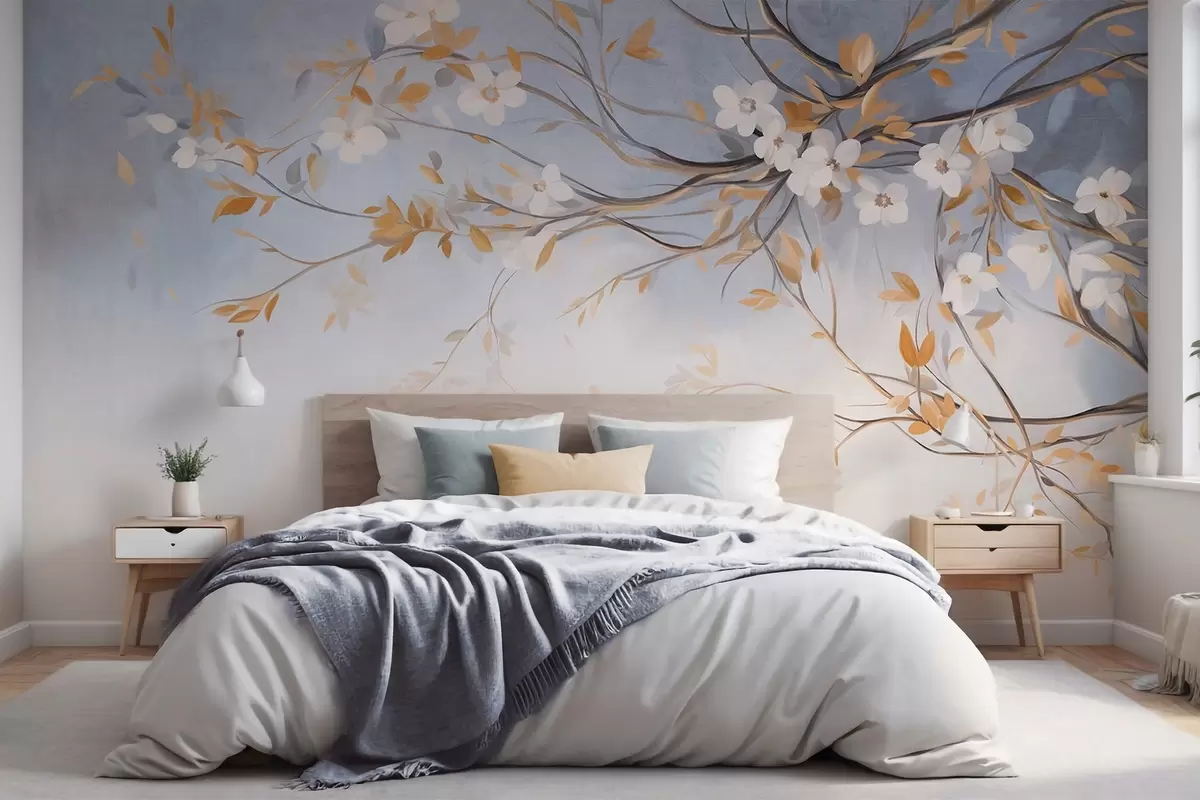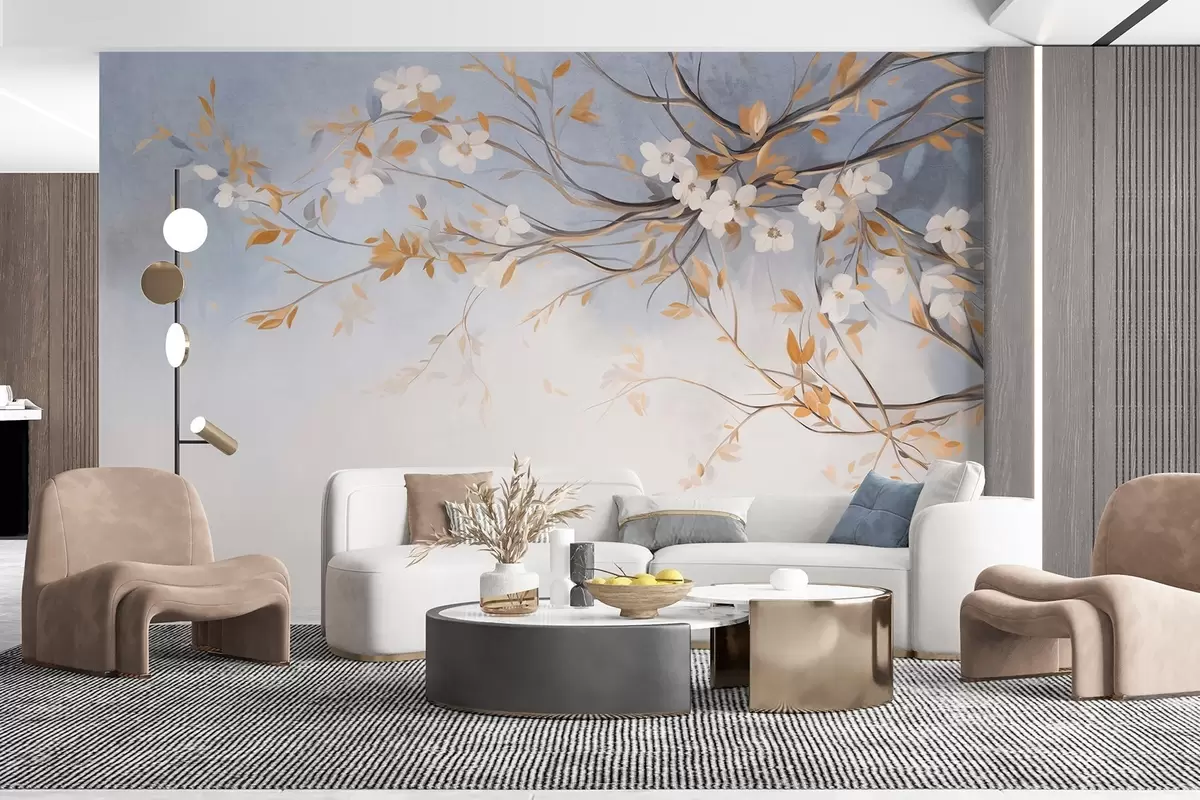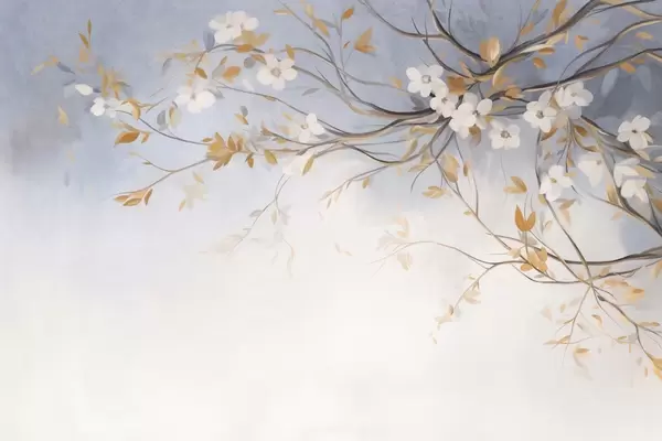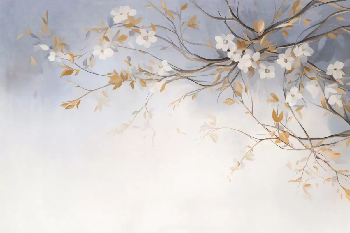 Carta da parati Fiori bianchi con foglie arancioni su un ramo d'albero, sfondo azzurro con texture, pennellate delicate nr. w09415