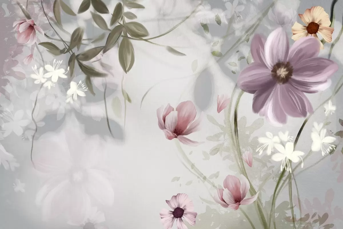 Carta da parati Fiori rosa e bianchi con steli e foglie verdi, illuminazione soffusa, colori tenui, composizione floreale nr. w09417v1