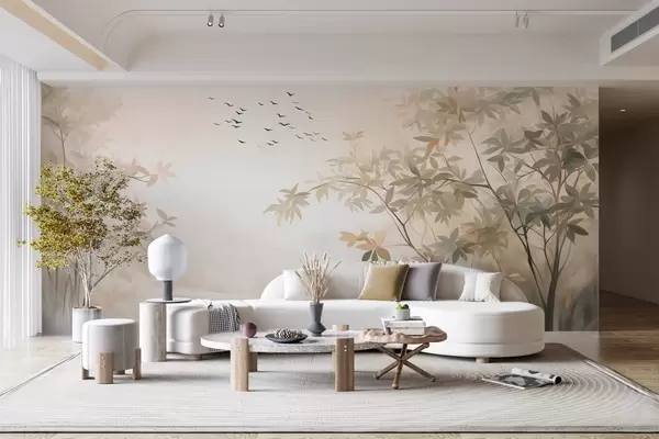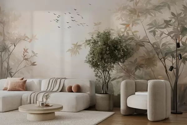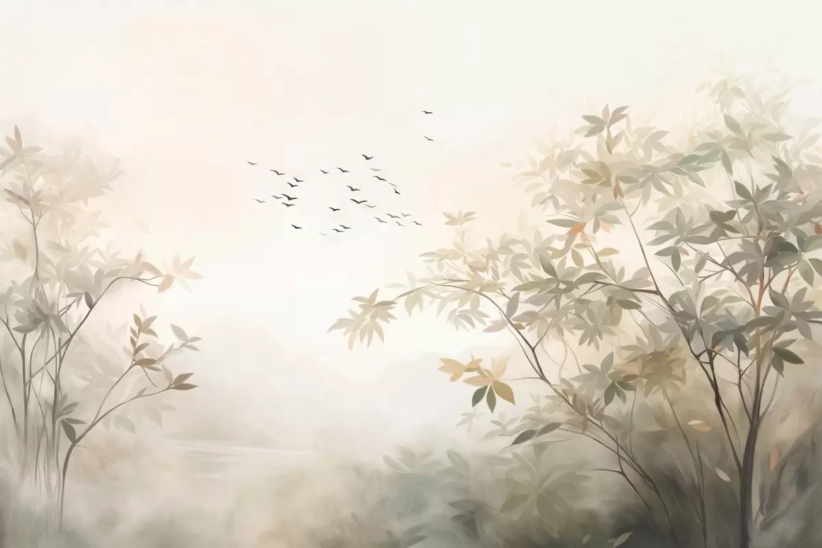 Carta da parati Paesaggio strutturato con alberi e uno stormo di uccelli che volano nel cielo, colori pastello, scena naturale nr. w09418