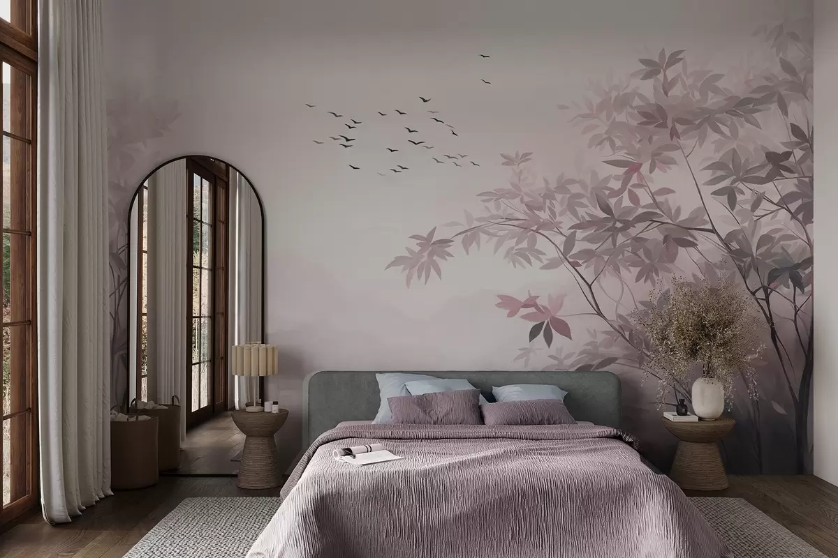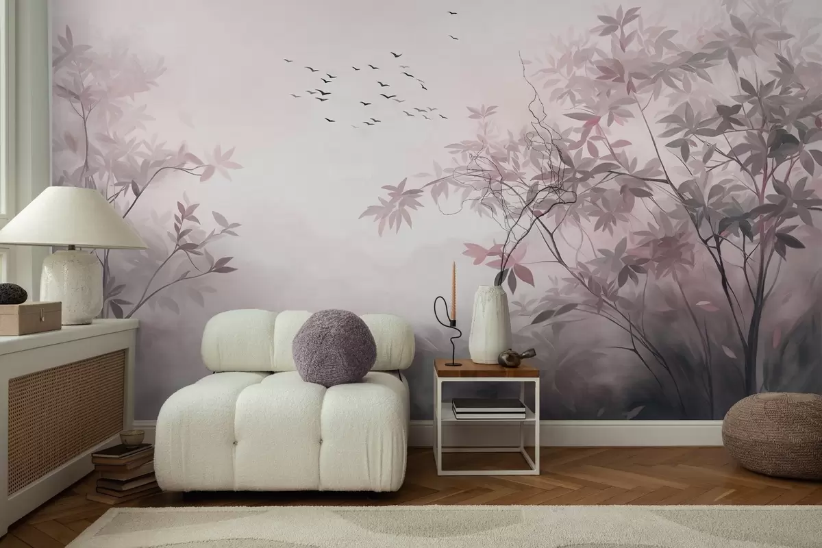 Carta da parati Paesaggio strutturato con alberi e uno stormo di uccelli che volano nel cielo, colori pastello, scena naturale nr. w09418v1