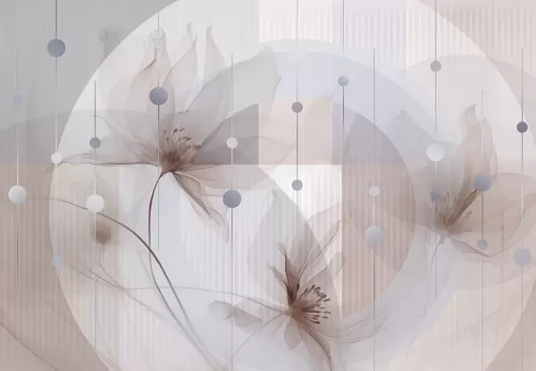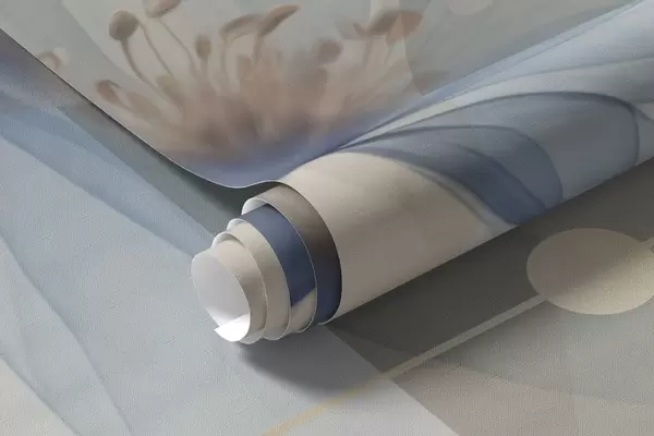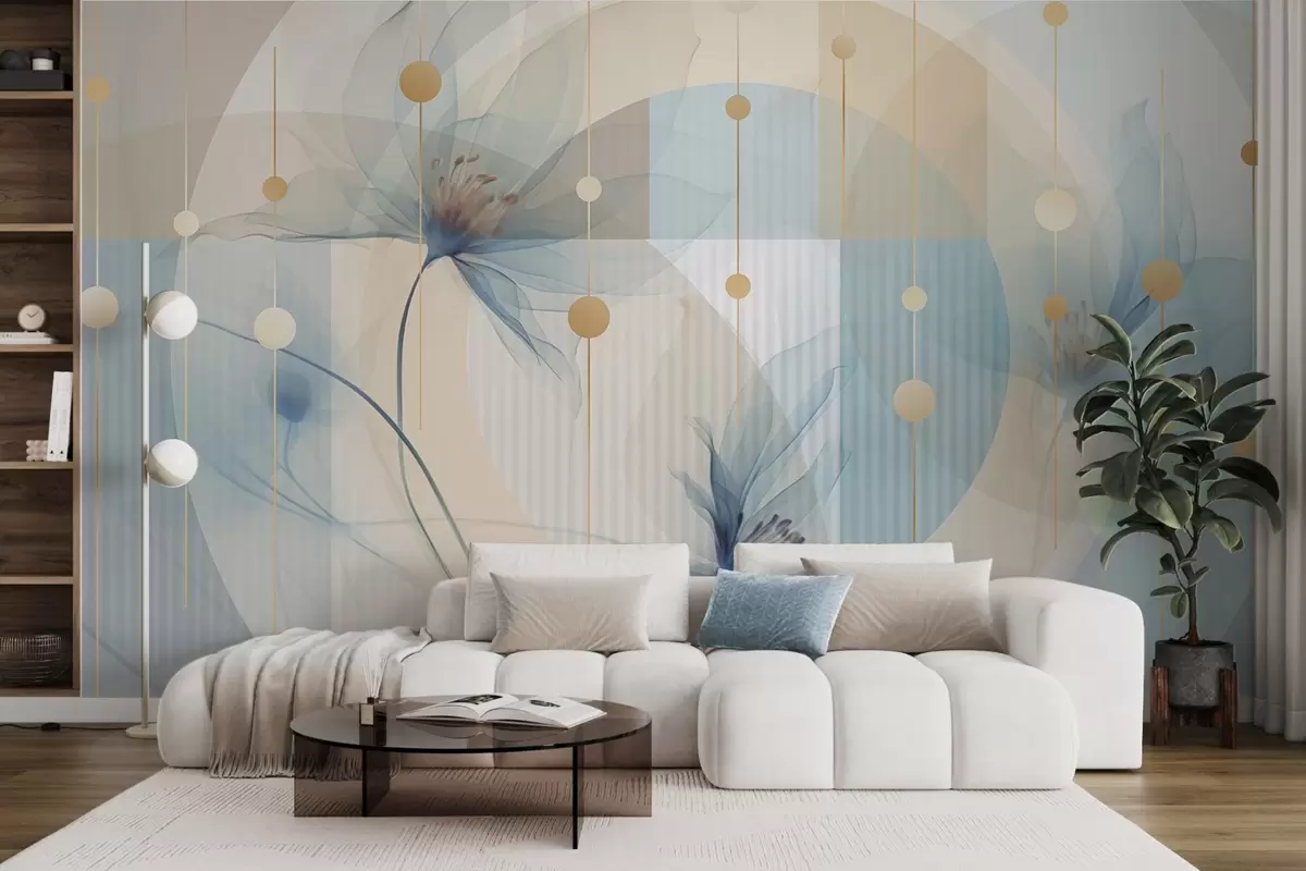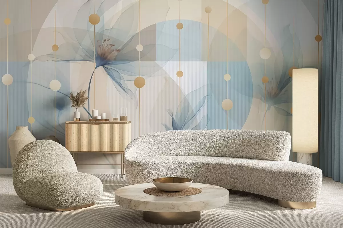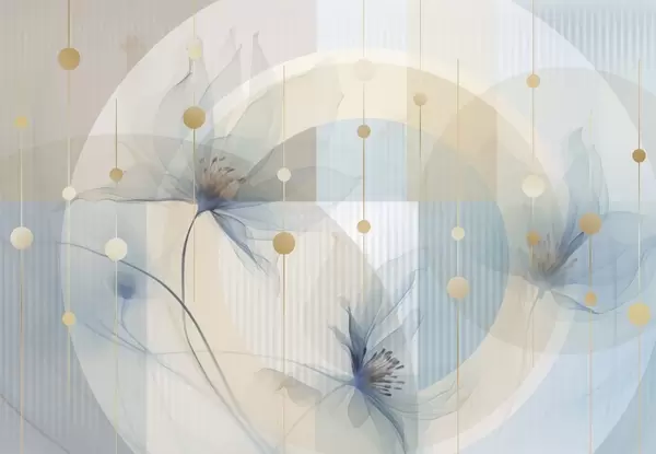 Carta da parati Fiori astratti traslucidi, cerchi e forme geometriche, palette di colori blu pastello, beige e bianco nr. w09419