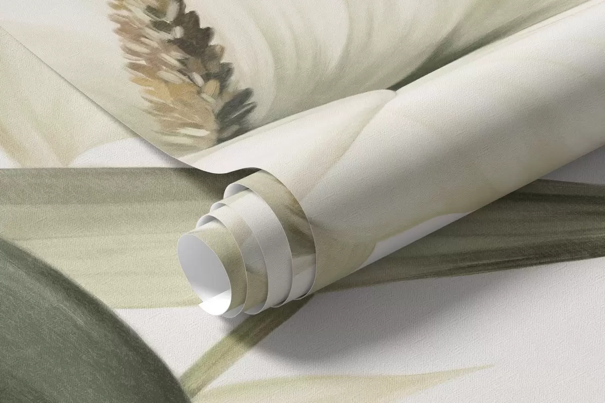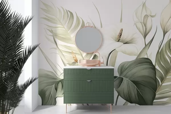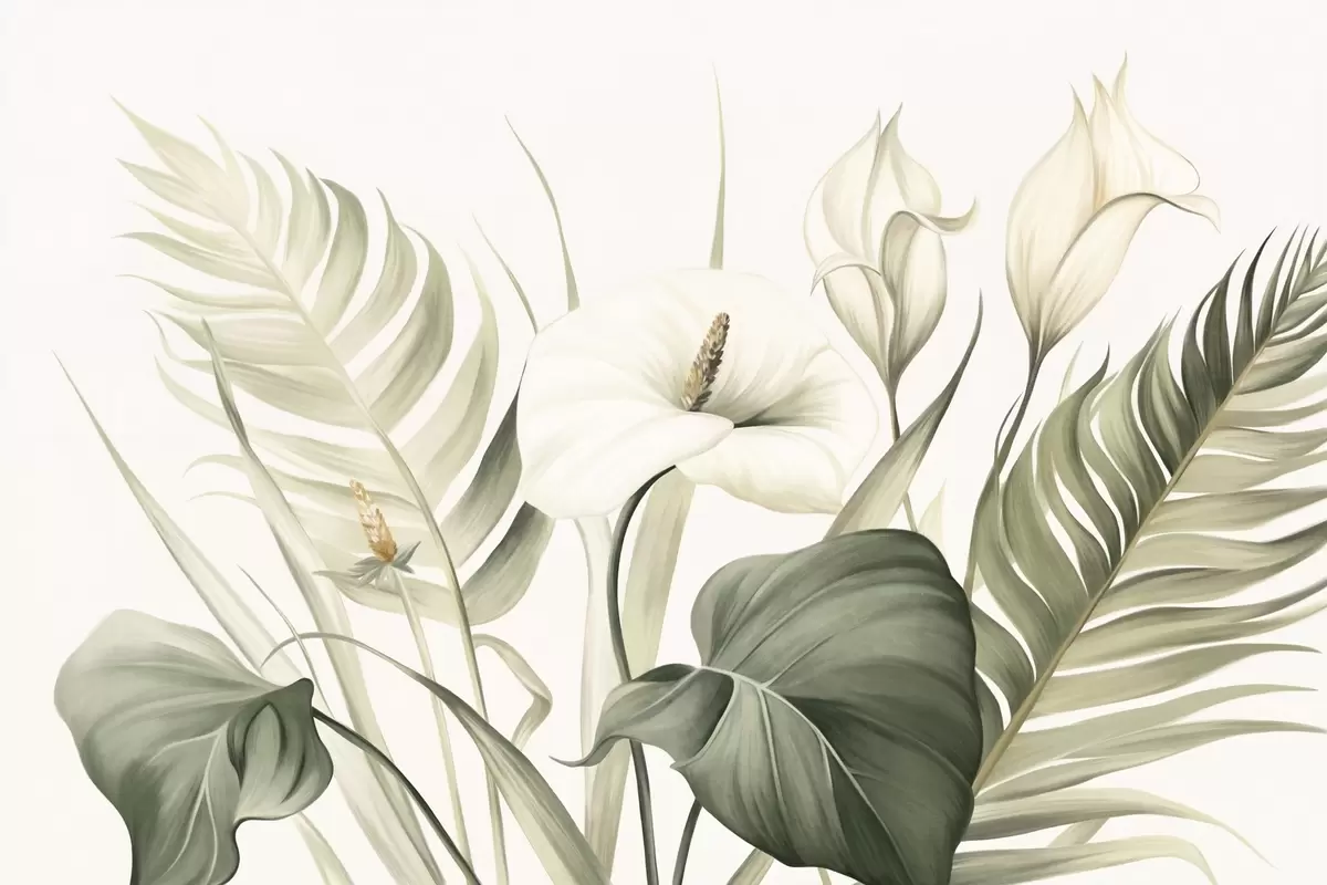 Carta da parati Calla bianche e foglie tropicali verdi, illustrazione botanica, sfondo chiaro, stile vintage, texture nr. w09423