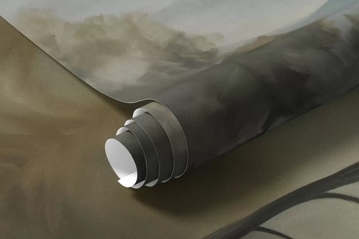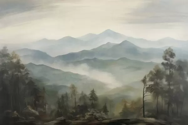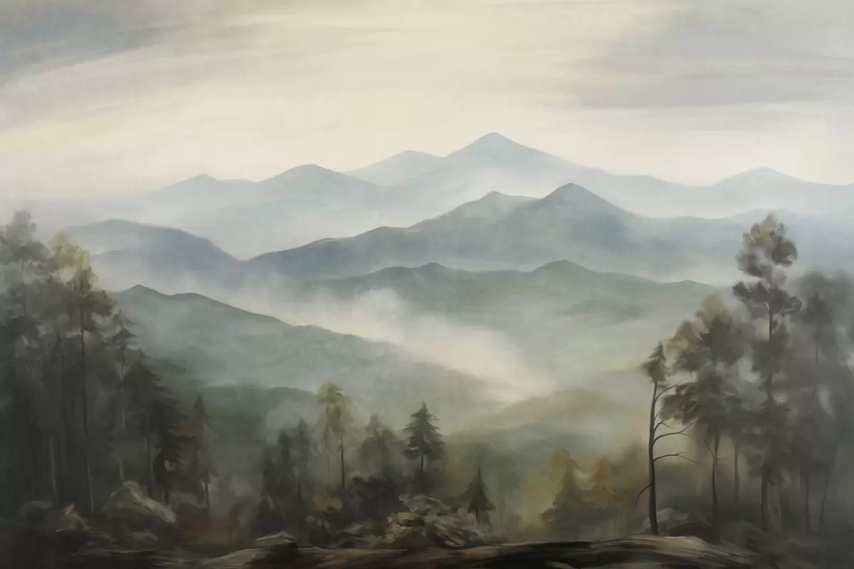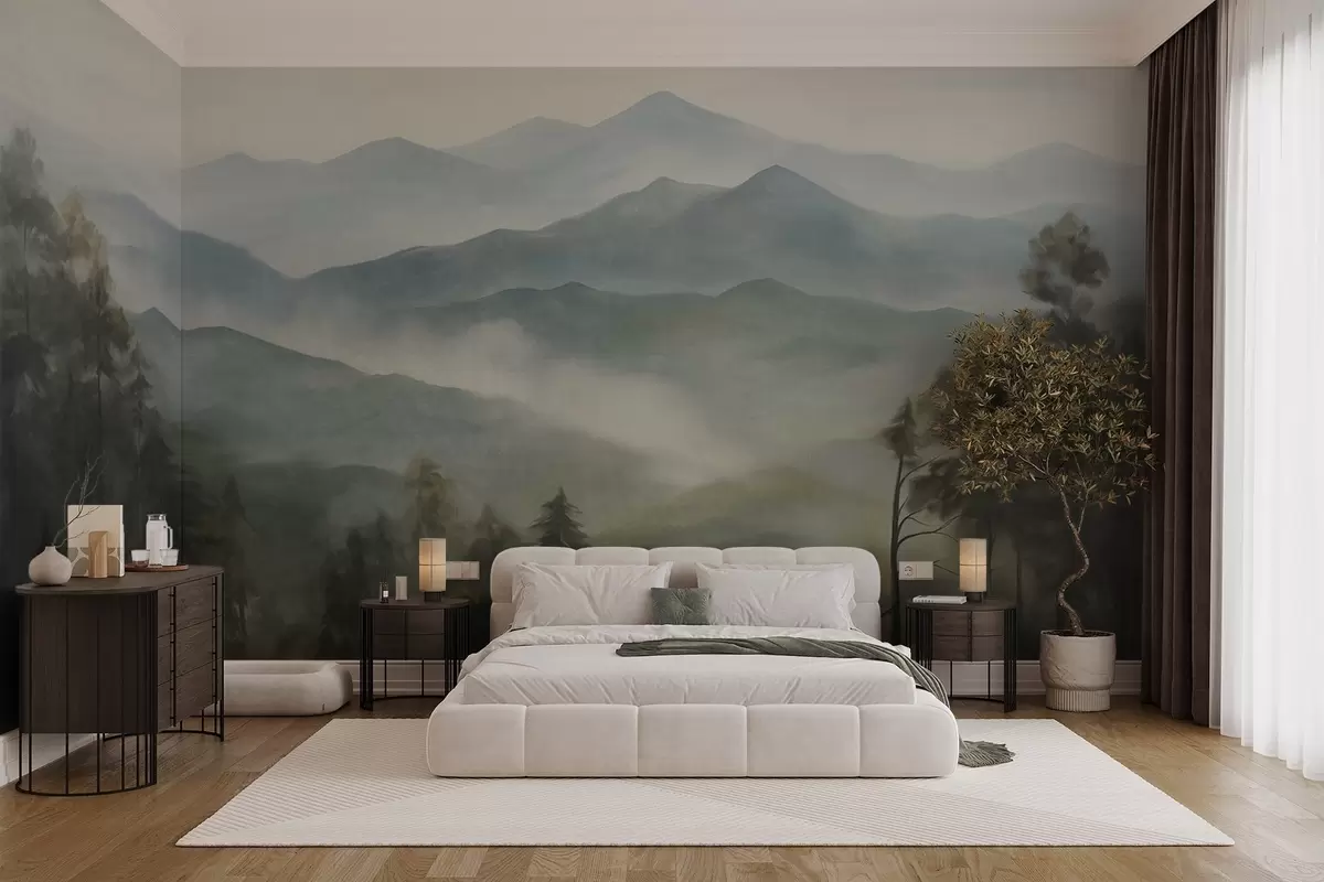 Carta da parati Catena montuosa nebbiosa con alberi, nebbia, cielo nuvoloso, colori tenui, stile pittorico paesaggistico nr. w09424