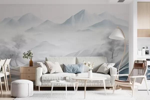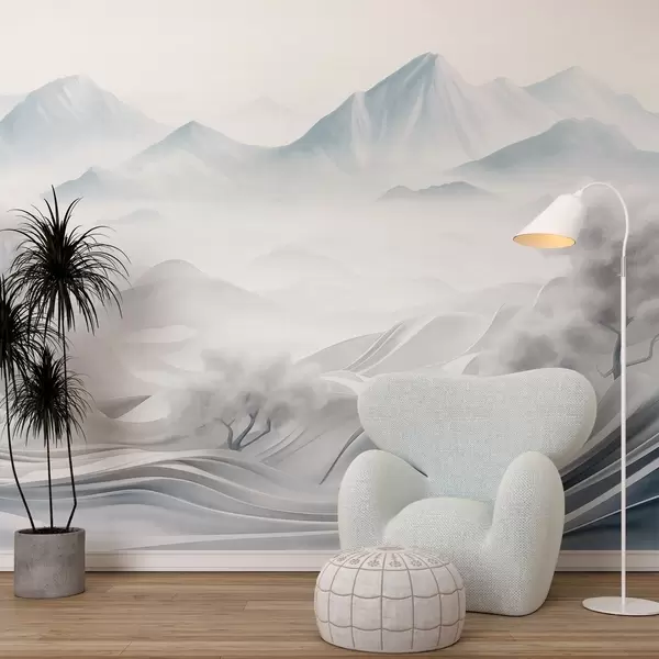 Carta da parati Paesaggio montano astratto innevato con alberi bianchi e nebbia, stile minimalista e materico nr. w09426