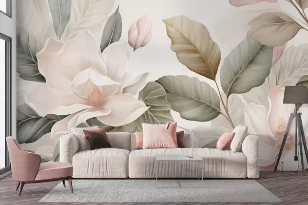 Carta da parati Fiori di magnolia con foglie dai colori pastello, bianco, rosa e verde, morbidi, delicati, in stile acquerello nr. w09427