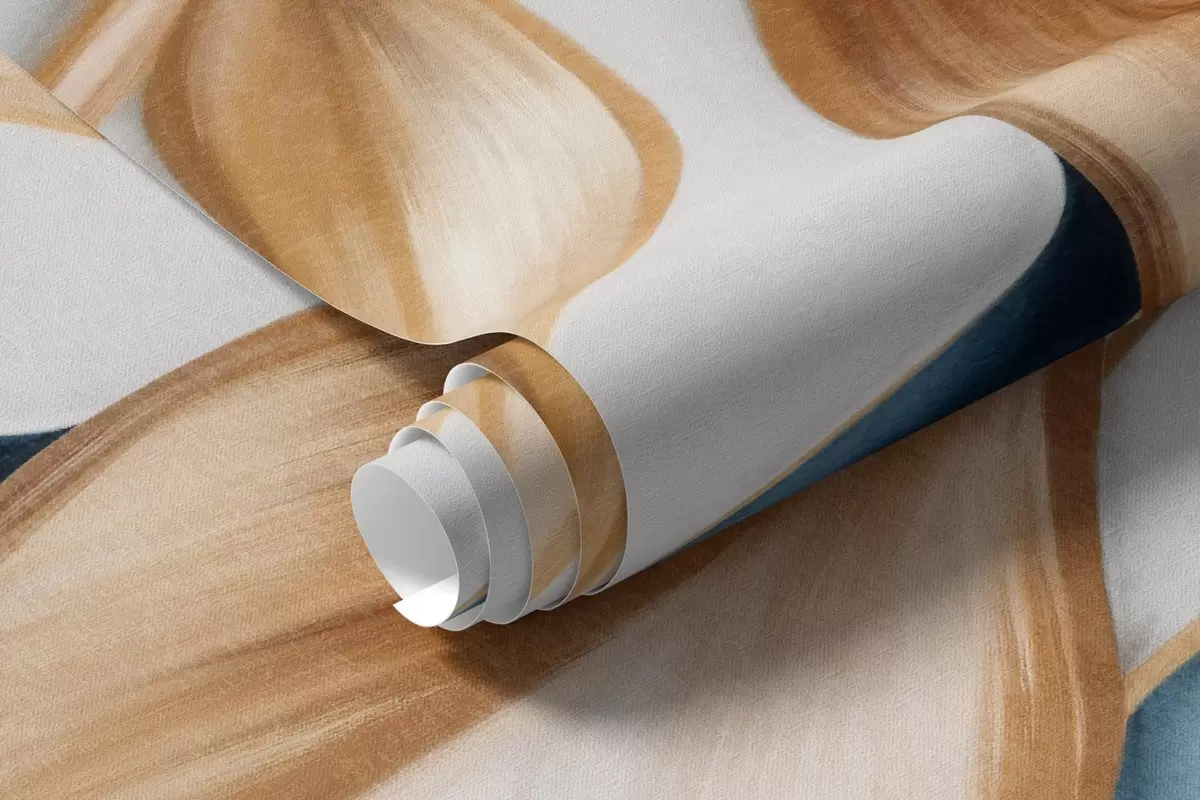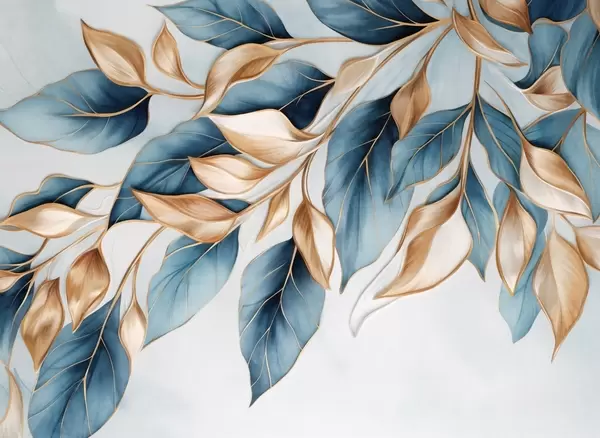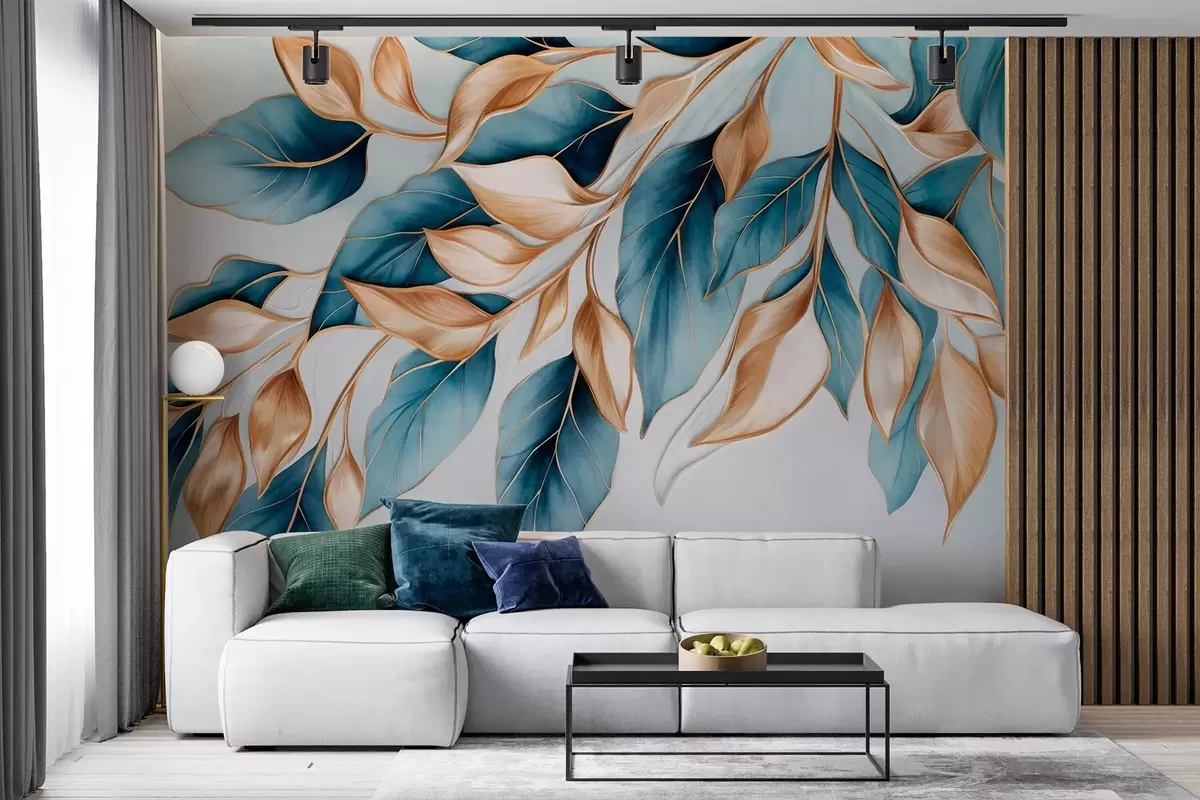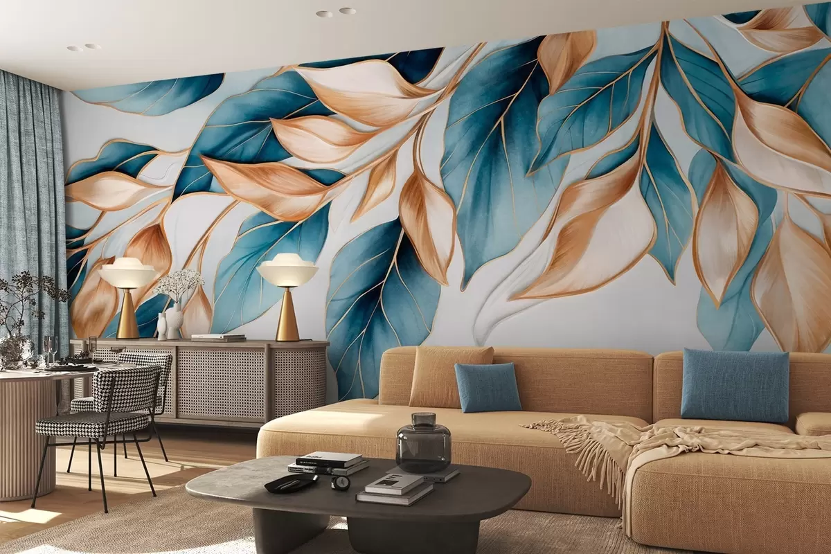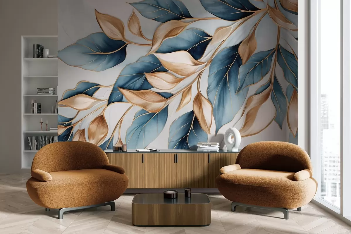 Carta da parati Foglie blu e arancioni con texture, sfondo azzurro, design elegante e artistico, stile moderno nr. w09429