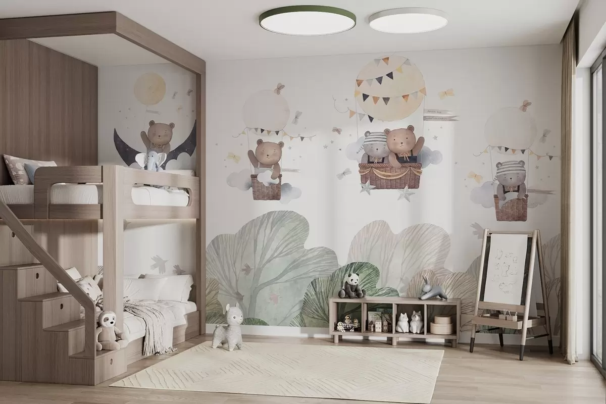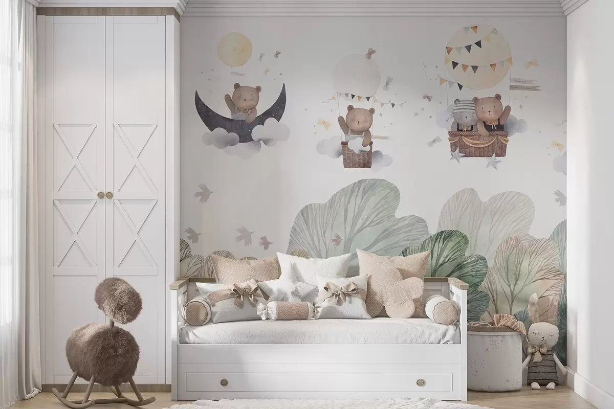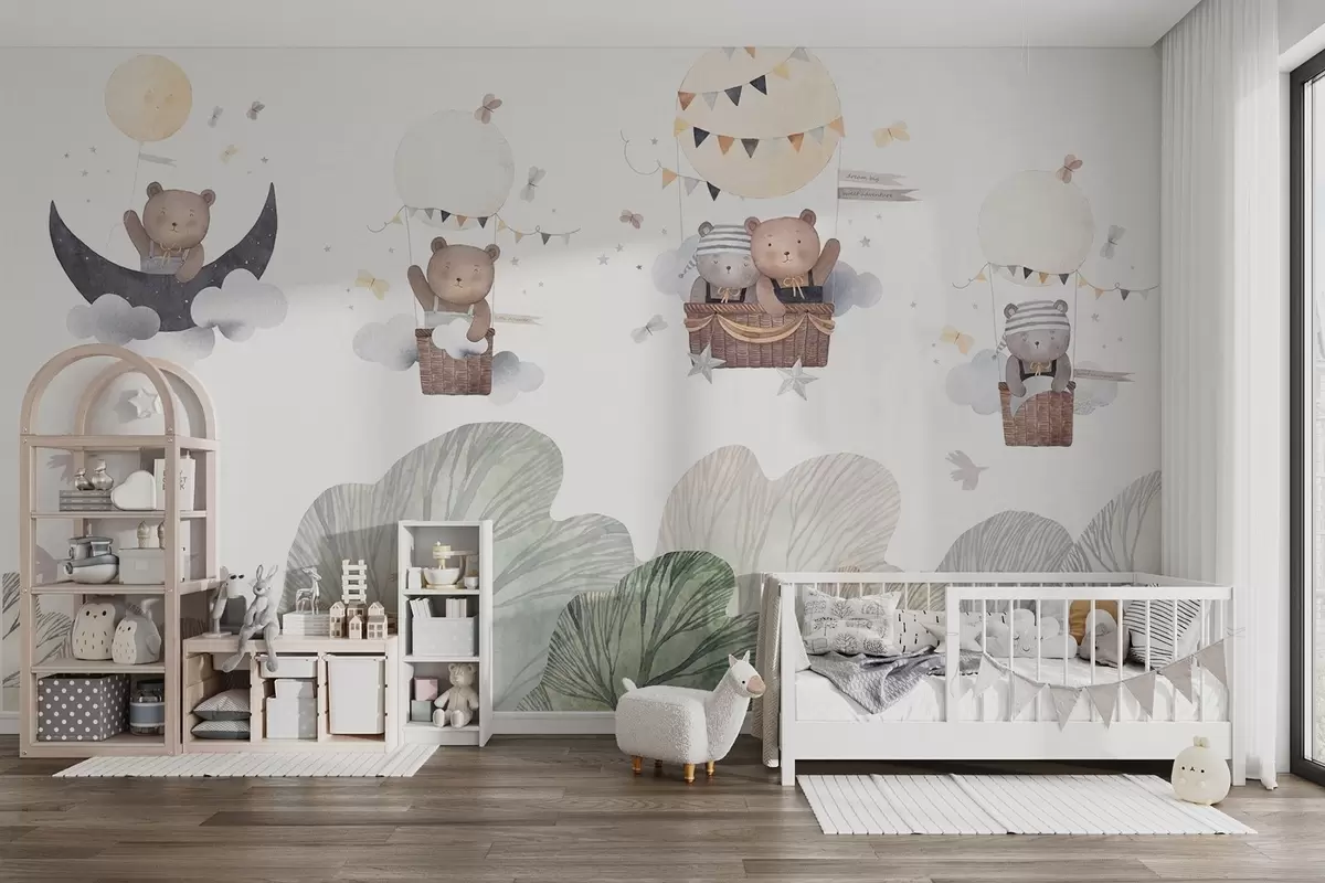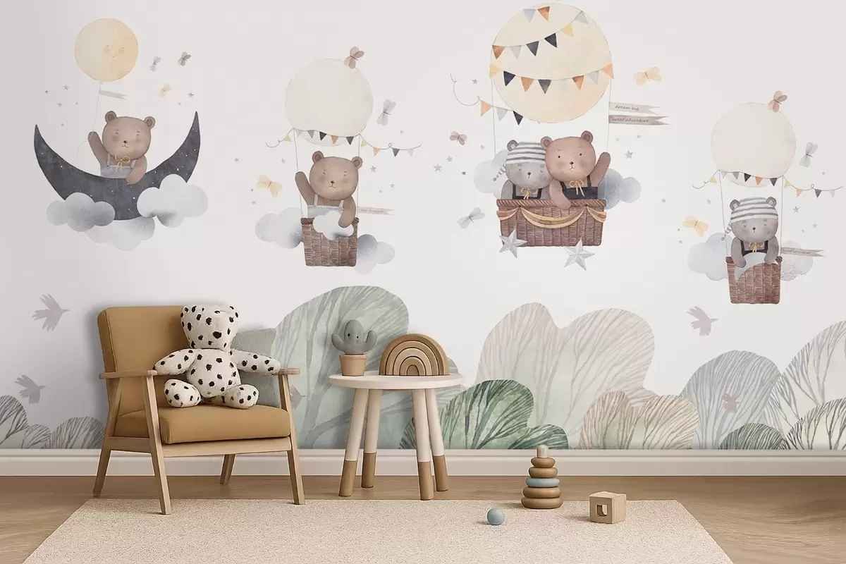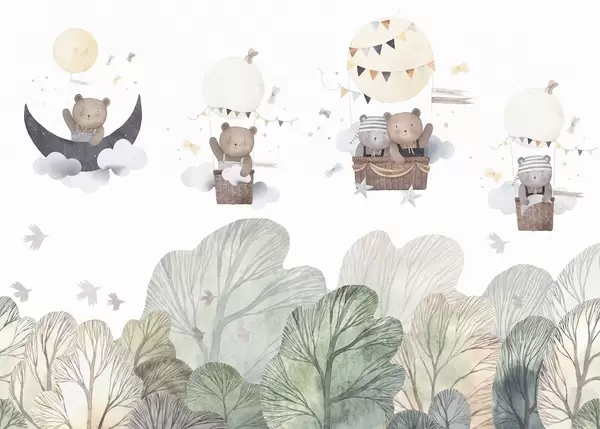 Carta da parati Palloncini in stile acquerello con orsi sopra la foresta nr. w09437