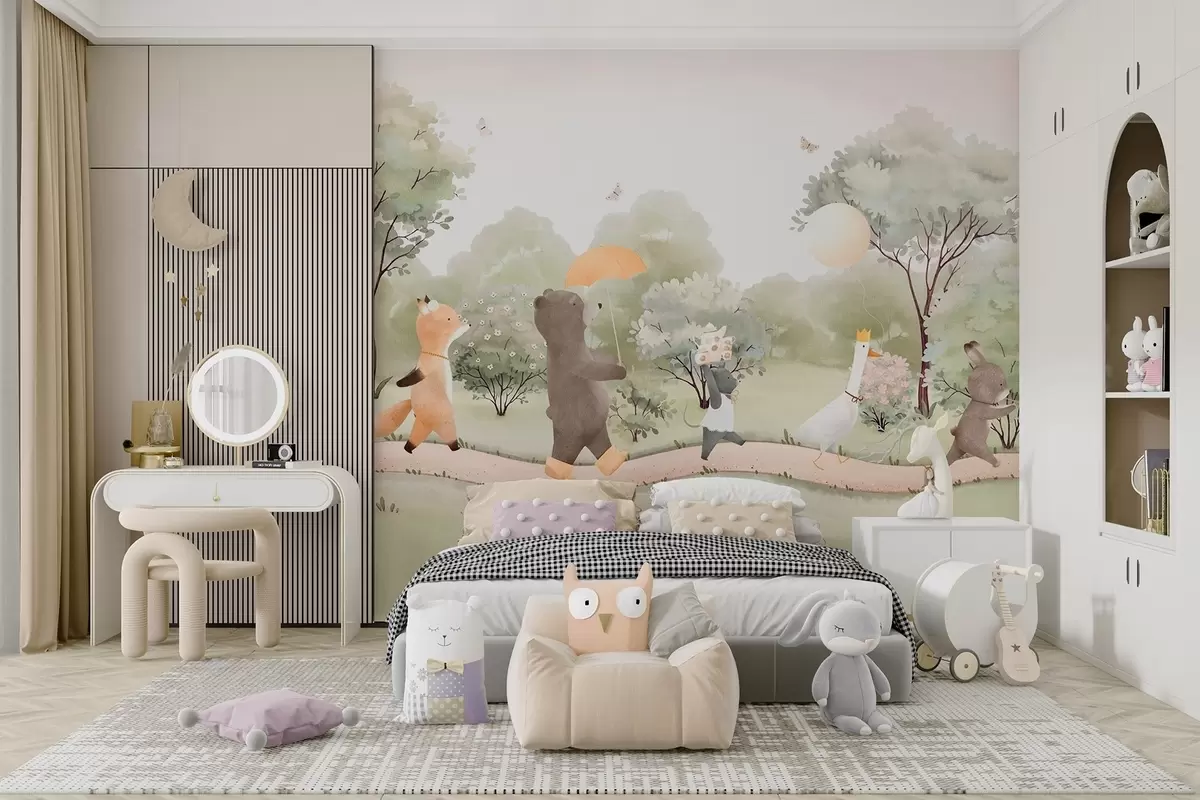 Carta da parati Viaggio festivo di piccoli animali attraverso la foresta in stile acquerello nr. w09440