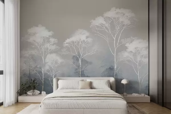 Carta da parati Alberi minimalisti in una palette di colori blu-grigio, nella nebbia nr. w09448
