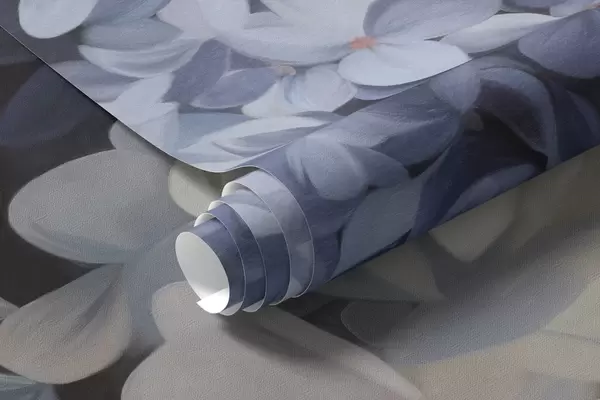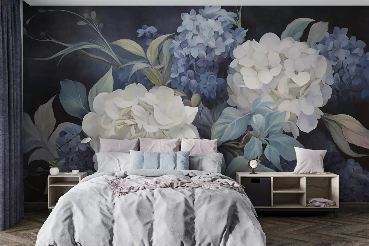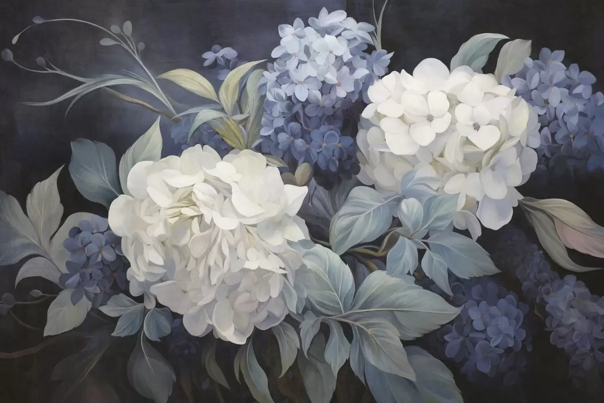Carta da parati Dipinto blu scuro con texture che imita fiori di ortensie con foglie grandi, sfondo astratto e scuro nr. w09465v1