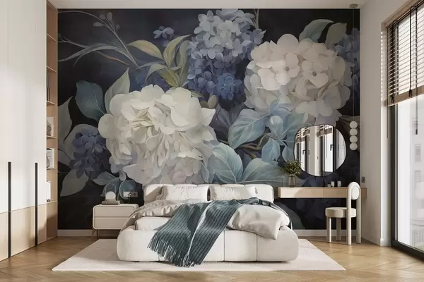 Carta da parati Dipinto blu scuro con texture che imita fiori di ortensie con foglie grandi, sfondo astratto e scuro nr. w09465v1