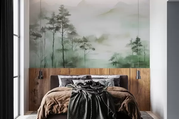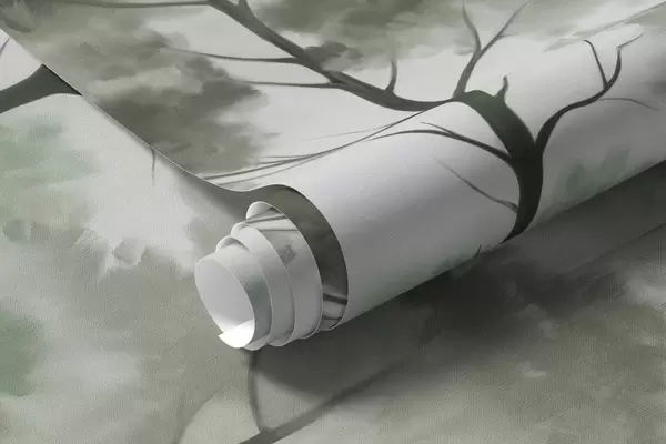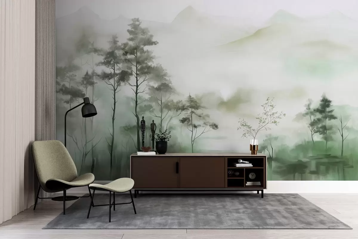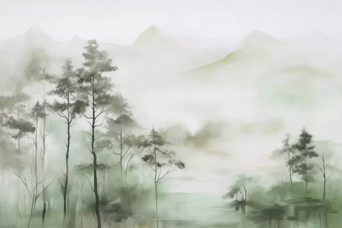 Carta da parati Paesaggio nebbioso con alberi ad alto fusto e montagne dai toni tenui di verde e grigio, stile minimalista, texture nr. w09469