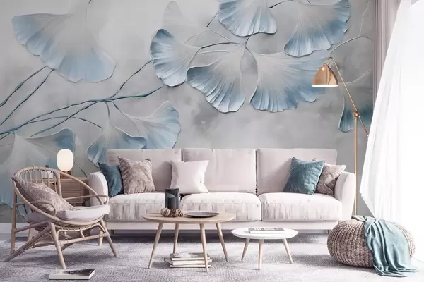 Carta da parati Foglie di ginkgo biloba con bordi blu su un ramo, sfondo grigio testurizzato, design elegante e minimalista nr. w09472v1