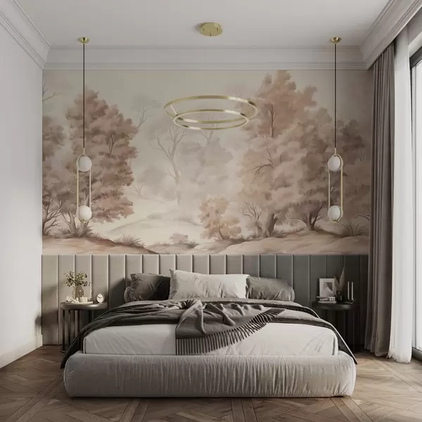 Carta da parati Dipinto paesaggistico materico che imita una foresta con alberi ad alto fusto ed erba, colori tenui e morbidi, scena rilassante nr. w09474